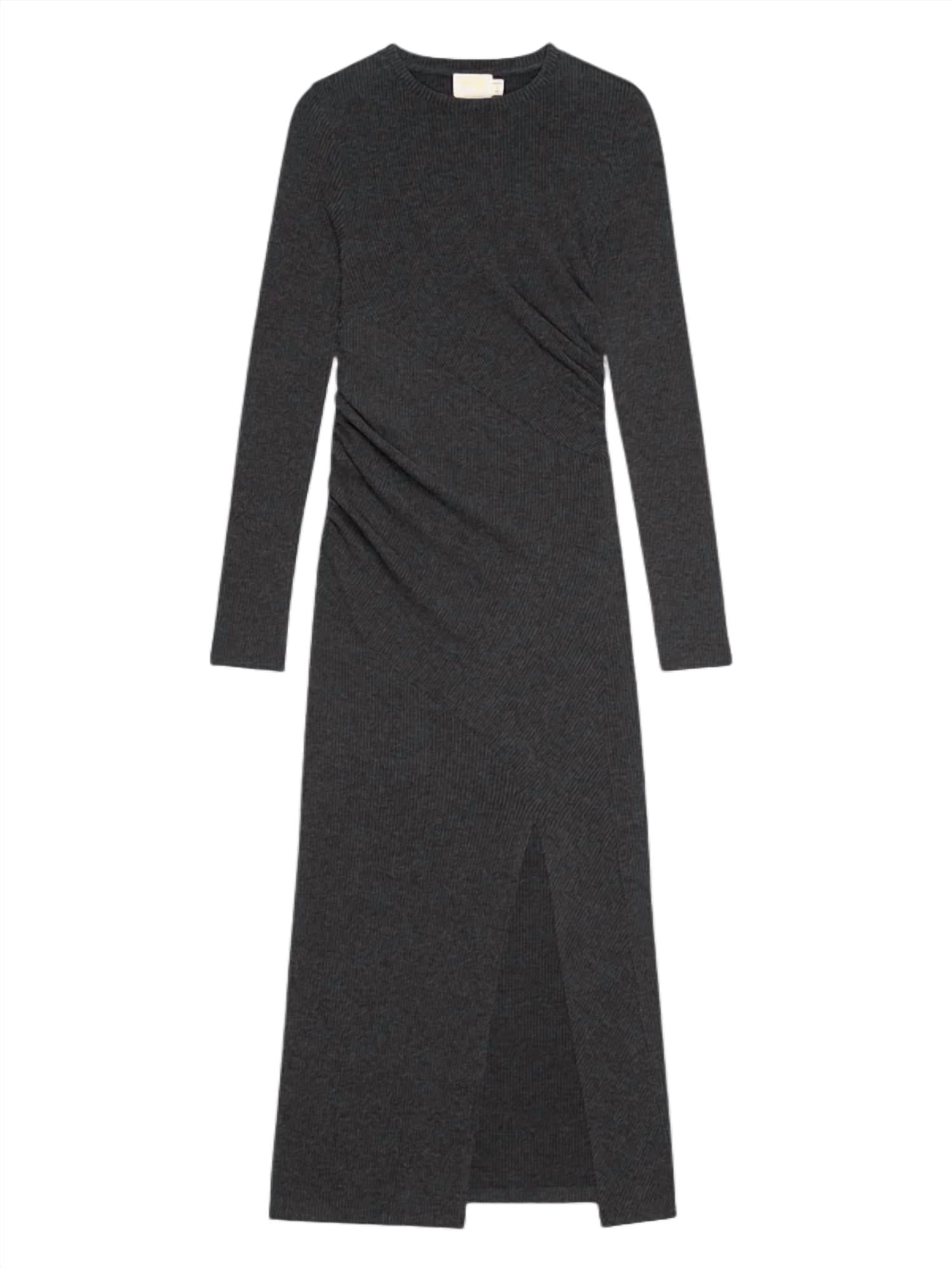 A midi dress so versatile, your options for wearing it are endless. Meet the Penn Midi Dress by Nation LTD, a sophisticated piece tailored for a sleek silhouette in Dark Charcoal Heather. This long sleeve, bodycon sweater dress features a flattering crewneck and a center front slit enriched with side shirring, making it ideal for a minimalist Thanksgiving look. Crafted from 48% Recycled Polyester, 48% Lenzing Modal, and 4% Spandex, the material is ultra-soft and bra-friendly with ribbed detail for added texture. Closure: Pull-on style. Care: Machine wash inside out and line dry to maintain its form; consider using a sweater stone to manage pilling. Model Sophie is 5'10" and wears a size S.