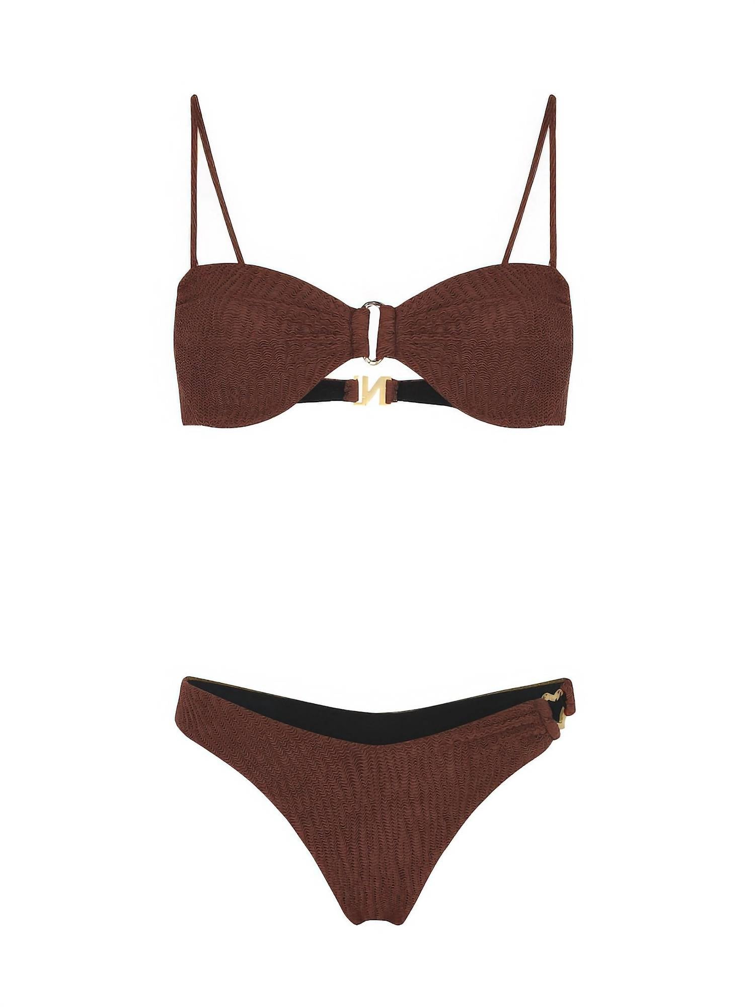 Ideal for relaxed poolside moments, this adorable swimsuit effortlessly transitions into the perfect sunset dinner outfit when paired with a flowing skirt. Embrace summer with Nelblu's Women's Ondas Crinkle Cheeky Bikini Bottom, a stylish swim essential in a captivating Marocco color. This bikini bottom features a cheeky coverage design accentuated by a chic gold hardware ring on one side, crafted from luxurious polyamide for a comfortable fit. Designed for beach days, it offers a low-rise, solid pattern that exudes confidence. Care for it delicately by washing with cold water and avoiding harsh agents such as bleach, fabric softeners, and direct contact with rough surfaces.