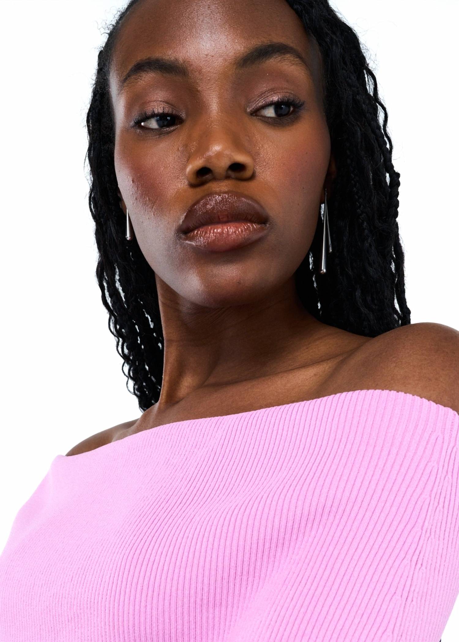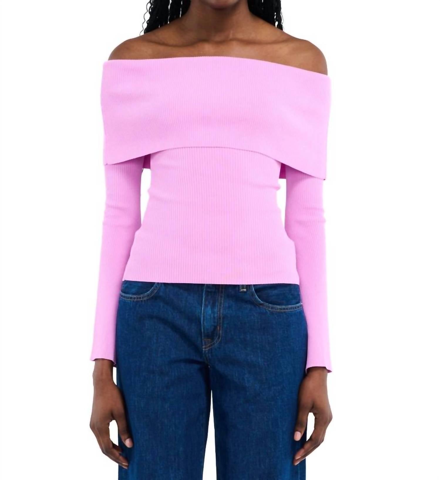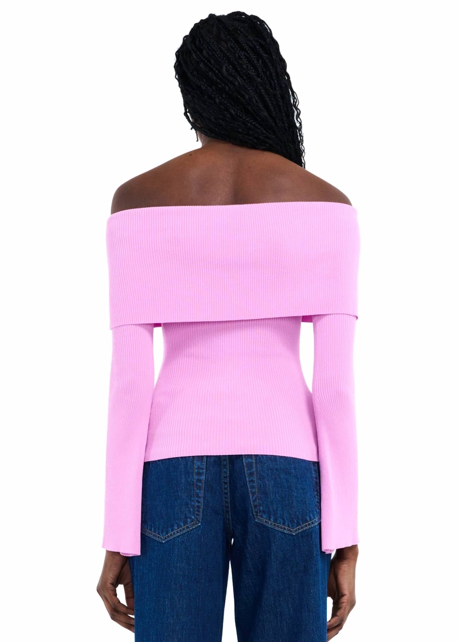 Show just the right amount of skin in the cutest sweater of the season. The NIA Palmer Off Shoulder Bell Sleeve Ribbed Sweater in pink is a chic addition to any wardrobe. Designed with feminine flair, this sweater features a stylish fold-over neckline and long bell sleeves. Made from a comfortable 65% viscose, 35% nylon blend, it's stretchable and unlined for a flattering fit. Closure: Pull-on style. Care: Hand wash. Ideal for spring evenings or special occasions, it pairs beautifully with both jeans and skirts.