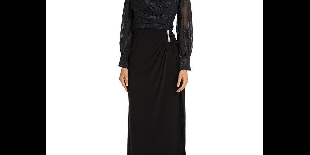 Nightway Women's Jacquard Faux Wrap Gown Black Size 8