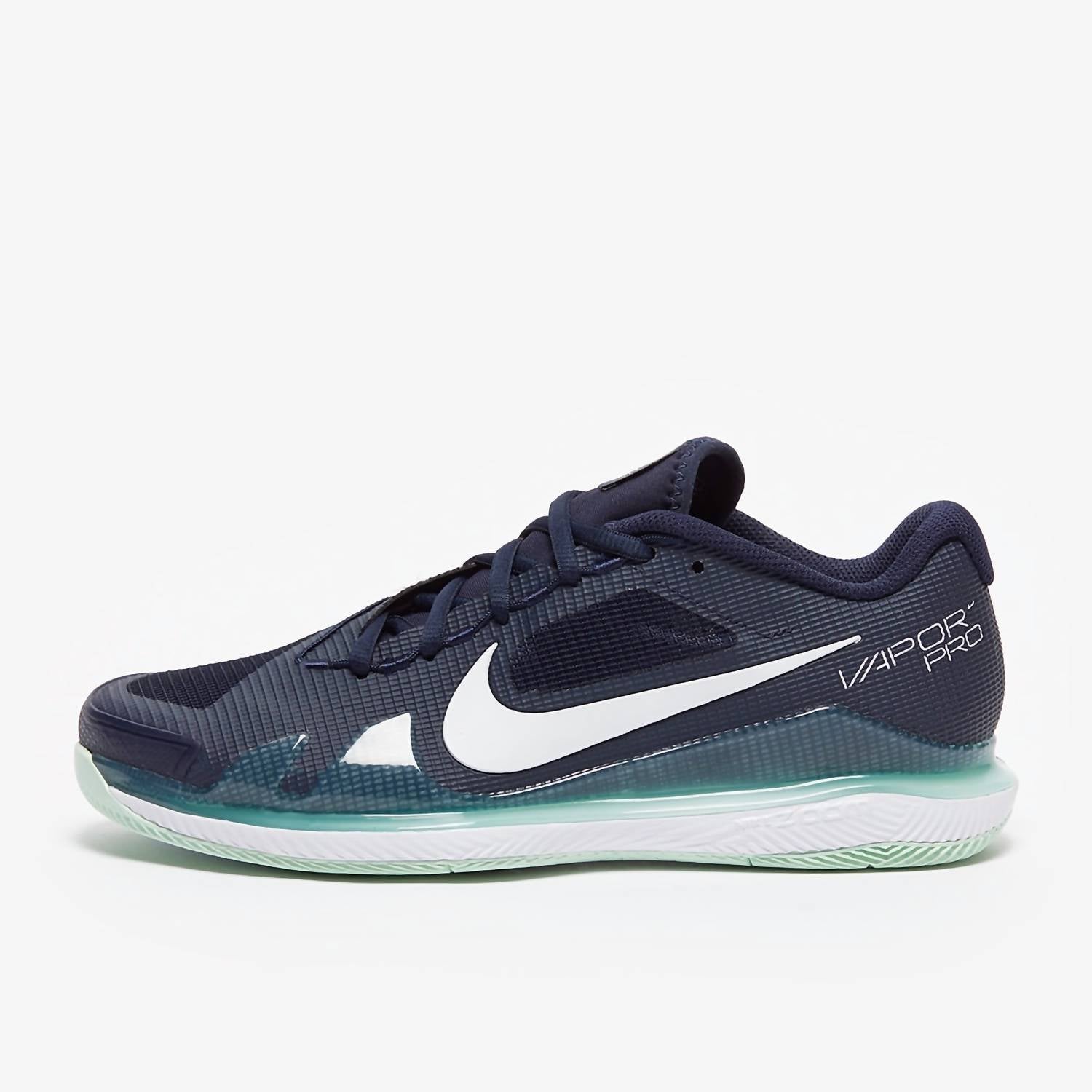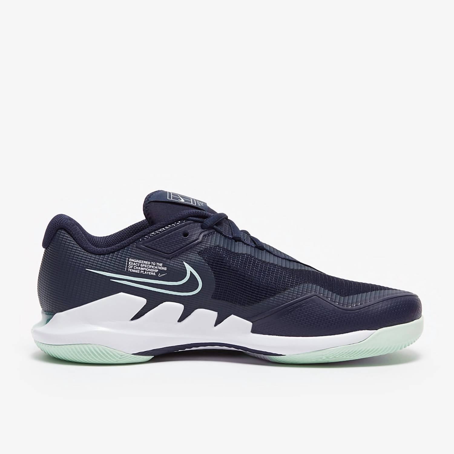 When fashion meets function. Experience agility and support in NIKE's Women's Air Zoom Vapor Pro Hard Court Tennis Shoes. With a breathable mesh upper enhanced by a flexible overlay and reinforced interior, your feet stay cool and supported during intense play. The shoes feature asymmetrical lacing and a soft foam midsole with a Zoom Air unit at the heel for responsive cushioning, complemented by a full-length foot frame for stability during quick movements. Designed in a stylish obsidian, white, and mint colorway, they are perfect for hard court surfaces with a removable insole for customized comfort.