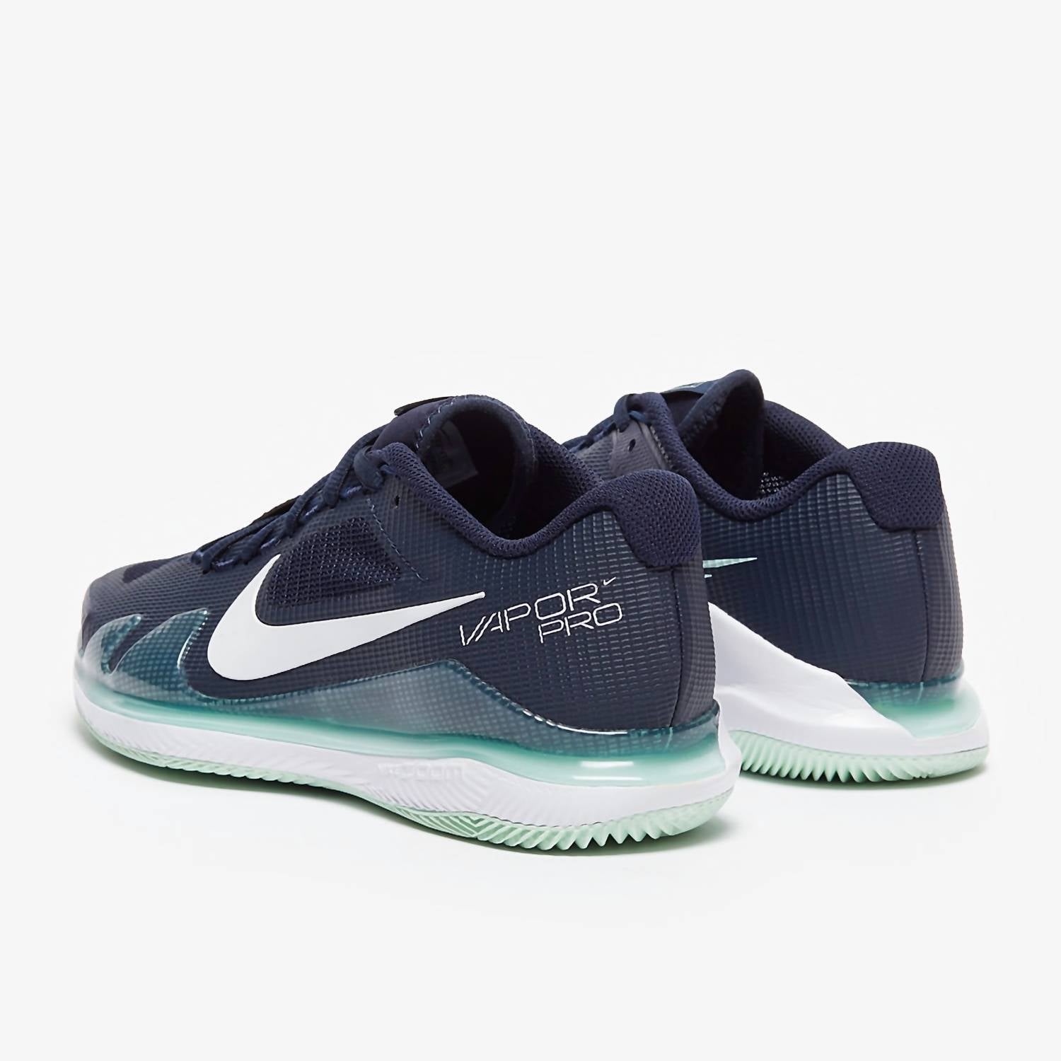 Experience agility and support in NIKE's Women's Air Zoom Vapor Pro Hard Court Tennis Shoes. With a breathable mesh upper enhanced by a flexible overlay and reinforced interior, your feet stay cool and supported during intense play. The shoes feature asymmetrical lacing and a soft foam midsole with a Zoom Air unit at the heel for responsive cushioning, complemented by a full-length foot frame for stability during quick movements. Designed in a stylish obsidian, white, and mint colorway, they are perfect for hard court surfaces with a removable insole for customized comfort.