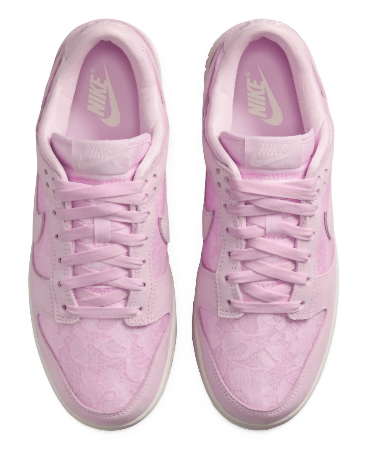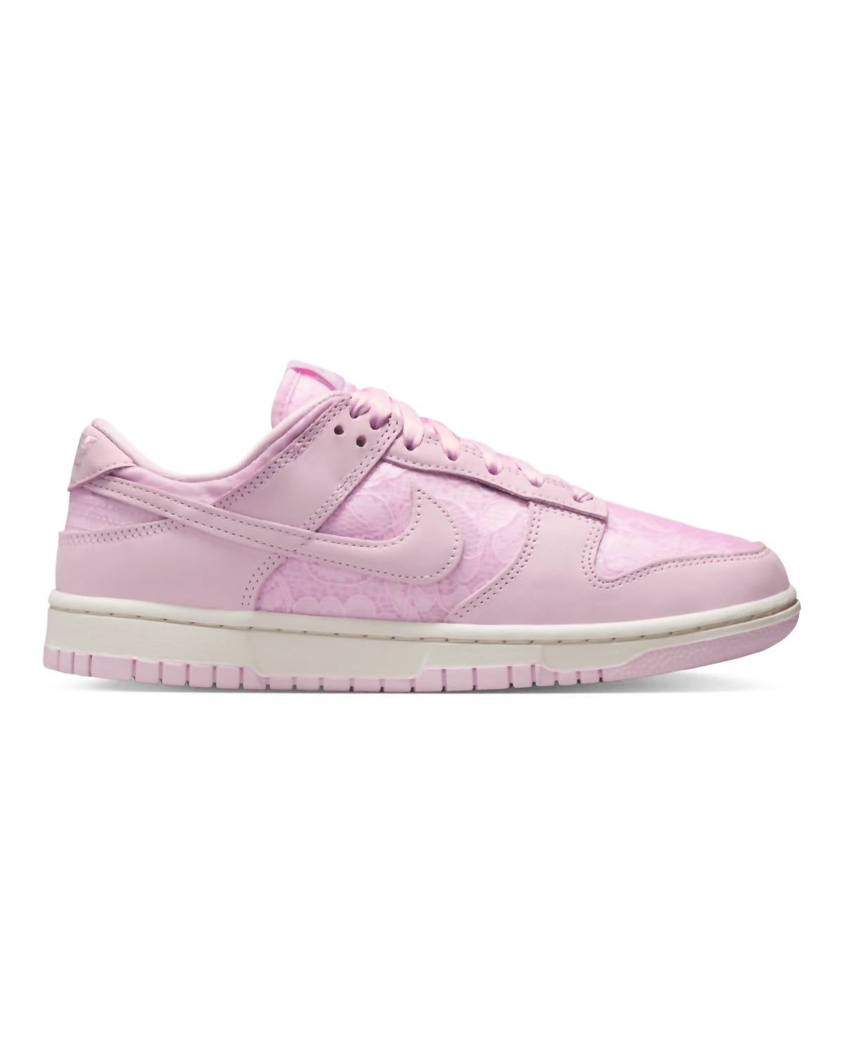 Stylish, comfortable and supportive. These athletic sneakers check all of the boxes. Step up your style with the NIKE Women's Dunk Low Shoes in Pink Lace, combining iconic design with modern comfort. These athletic shoes feature a round toe shape and offer the perfect flat heel height of 1" or under for all-day wear. Made with quality materials, including durable rubber, they are crafted to keep up with your active lifestyle. Suitable for any athletic occasion, this pair adds a touch of elegance and color to your footwear collection.