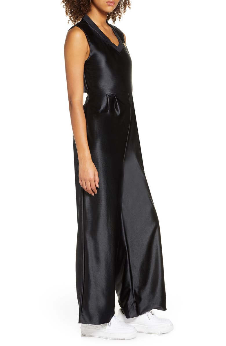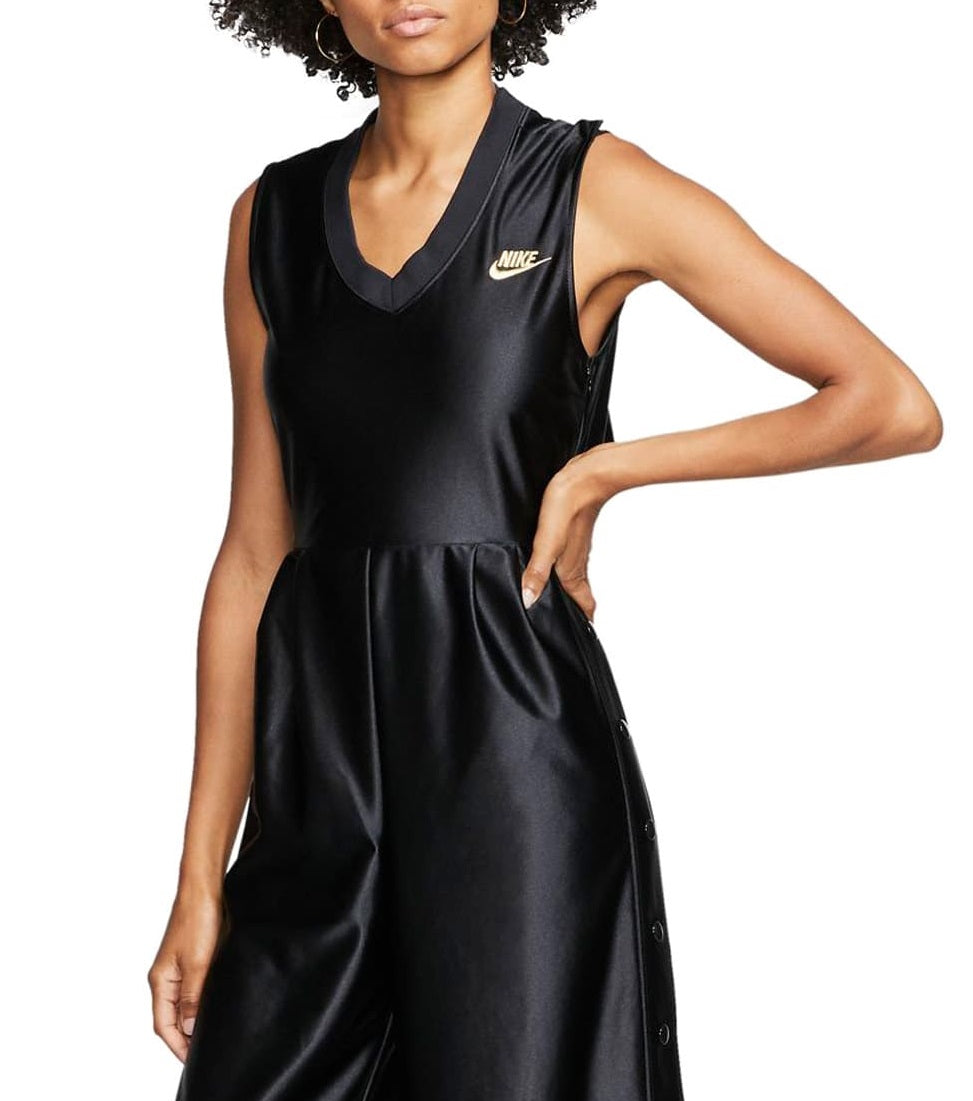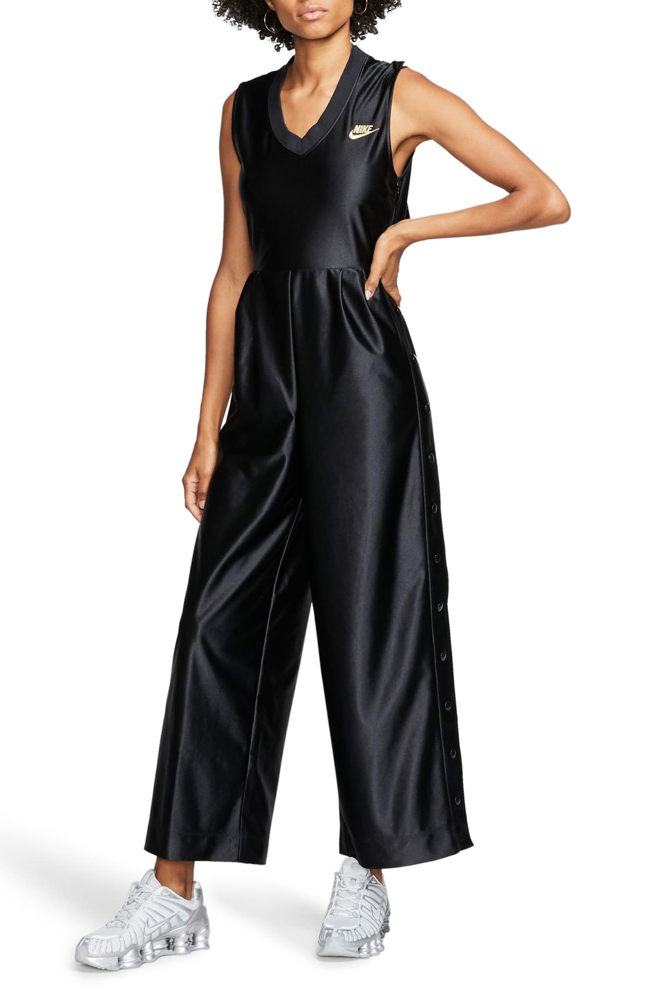 56 1/2 length; 28 1/2 inseam; 25 leg opening (size Medium)|Hidden side zip and shoulder snaps closure|V-neck|Sleeveless|Cutout with elastic back waist|Side snaps|100% polyester