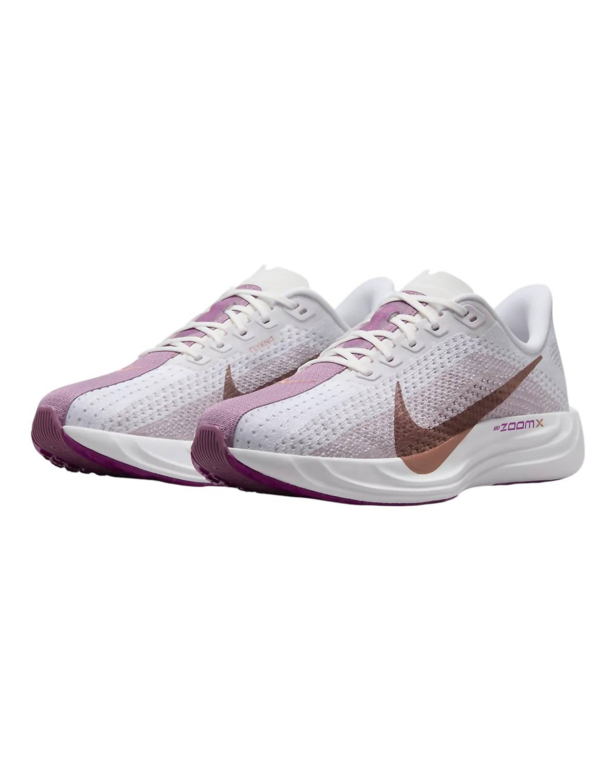 Workout in style with these adorable athletic sneakers. Experience a new level of comfort with this athletic shoe, featuring lightweight ZoomX foam for exceptional energy return on every run. The stretchy Flyknit upper provides a seamless fit, while the shoe's flat heel, medium width, and classic round toe shape enhance overall comfort. Available in stylish White, Platinum Violet, Plum Dust, and Metallic Red Bronze, it's built with durable rubber for reliable performance, run after run.