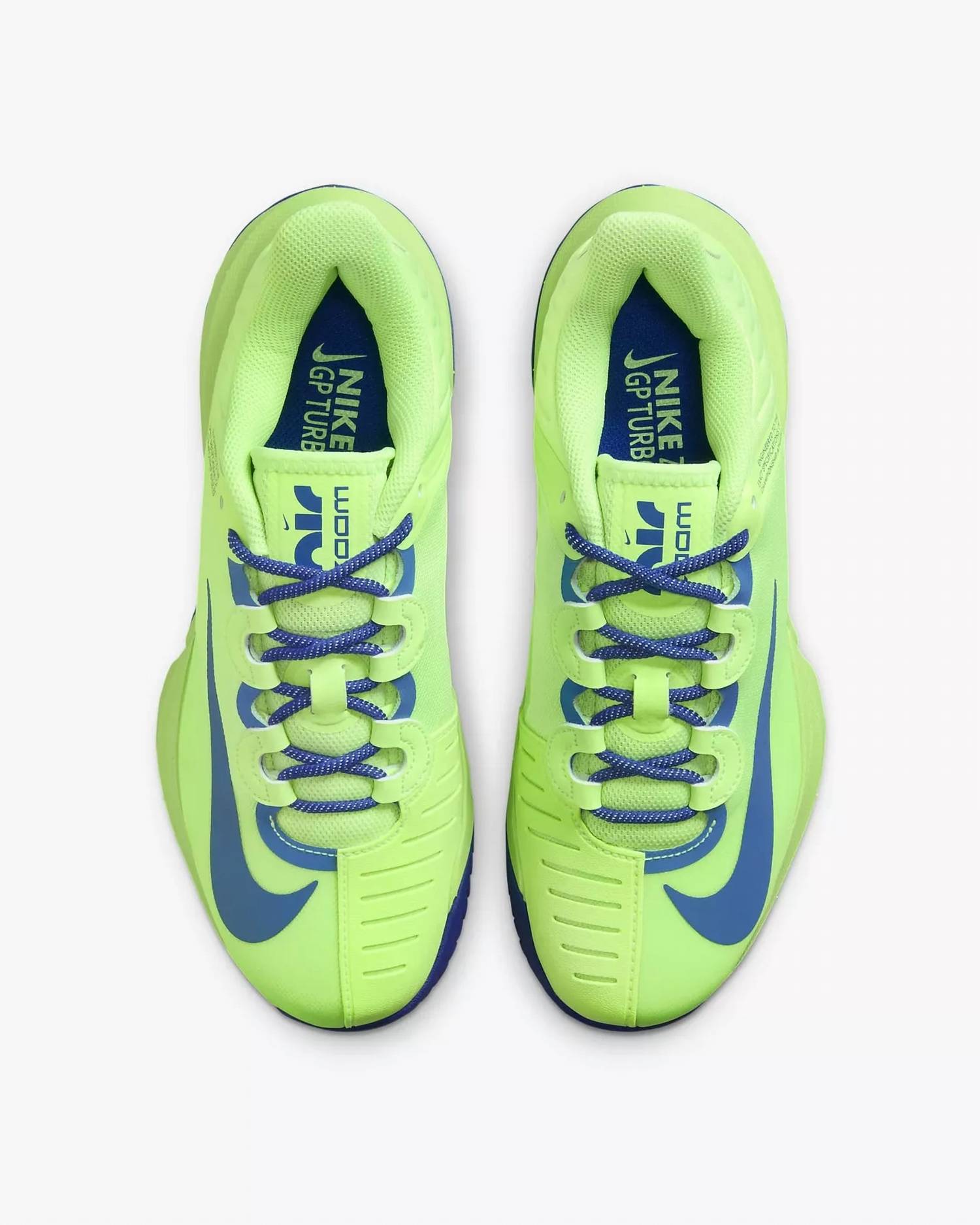 Workout in style with these adorable athletic sneakers. Elevate your tennis game with the Women's Zoom GP Turbo Osaka Shoes by NIKE, perfect for athletes who demand both style and performance. These shoes feature a low-top design and regular sole, ensuring comfort and agility on the court. The flat heel and round toe offer a classic sneaker silhouette, while the lacing closure provides a secure fit. Available in an eye-catching Lime Blast/Indigo Force/Noise Aqua colorway and crafted in China, these shoes are a stylish, reliable option for tennis enthusiasts.