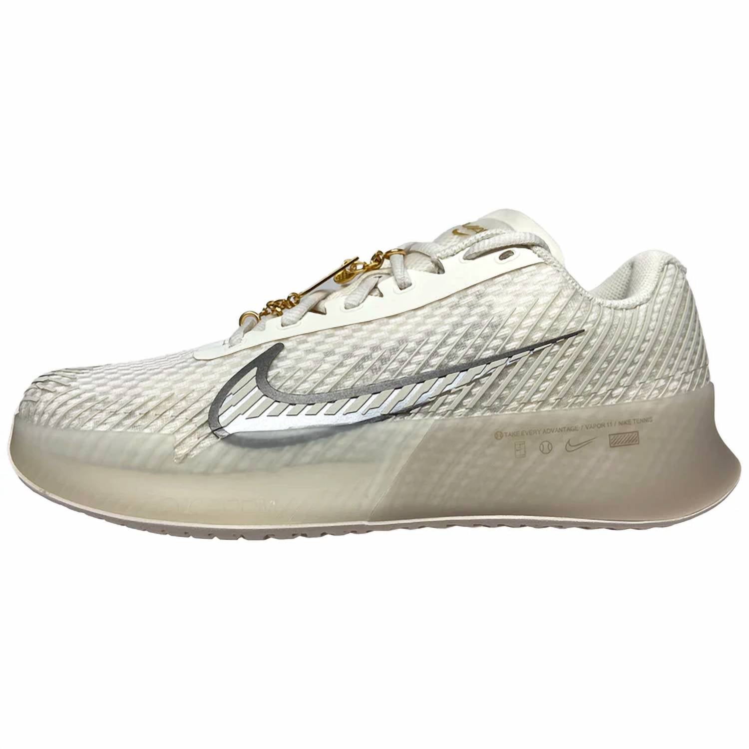 Stylish, comfortable and supportive. These athletic sneakers check all of the boxes. Crafted for peak athletic performance and vibrant style. The design features a lightweight, breathable upper in Pale Ivory/Metallic Silver, enhanced by multicolor accents for a standout look. These shoes boast a 1/2-inner sleeve for easy wear, paired with a responsive Zoom Air unit to propel you across the court. Ideal for fast-paced play, their flat heel and almond toe shape ensure comfort and agility on the go.