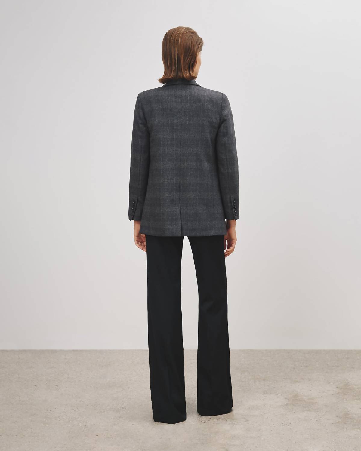 Nili Lotan Diane Blazer in Charcoal Plaid. Slightly oversized classic constructed blazer. Flap pockets. Chest welt pocket. Interior pocket. Button closure. Cuff buttons. 90% wool, 8% cashmere, 2% elastane. Size 4 measures approximately 29.5" front body length, 15.5" across shoulders, and 38 1/4" chest circumference. Made in USA.