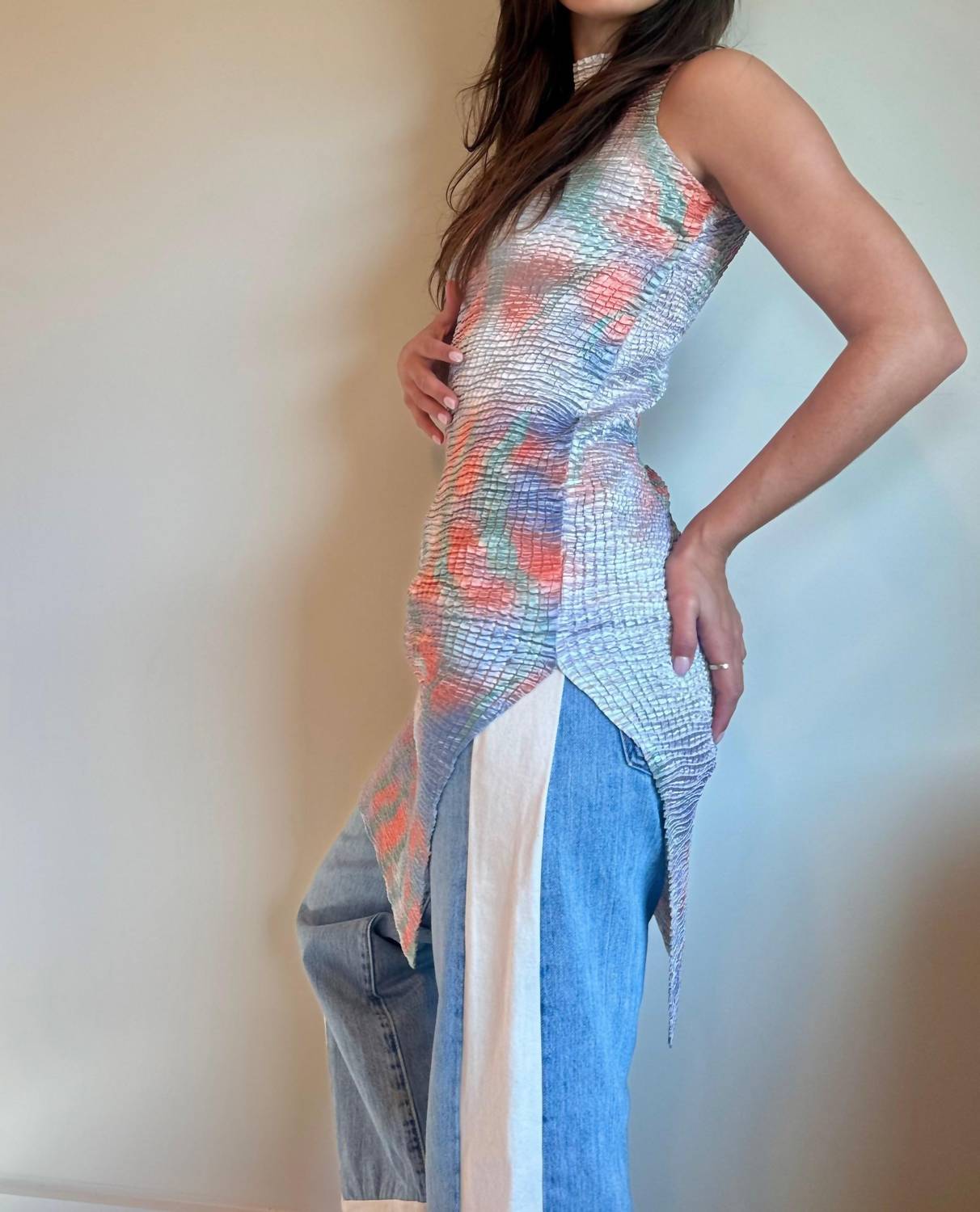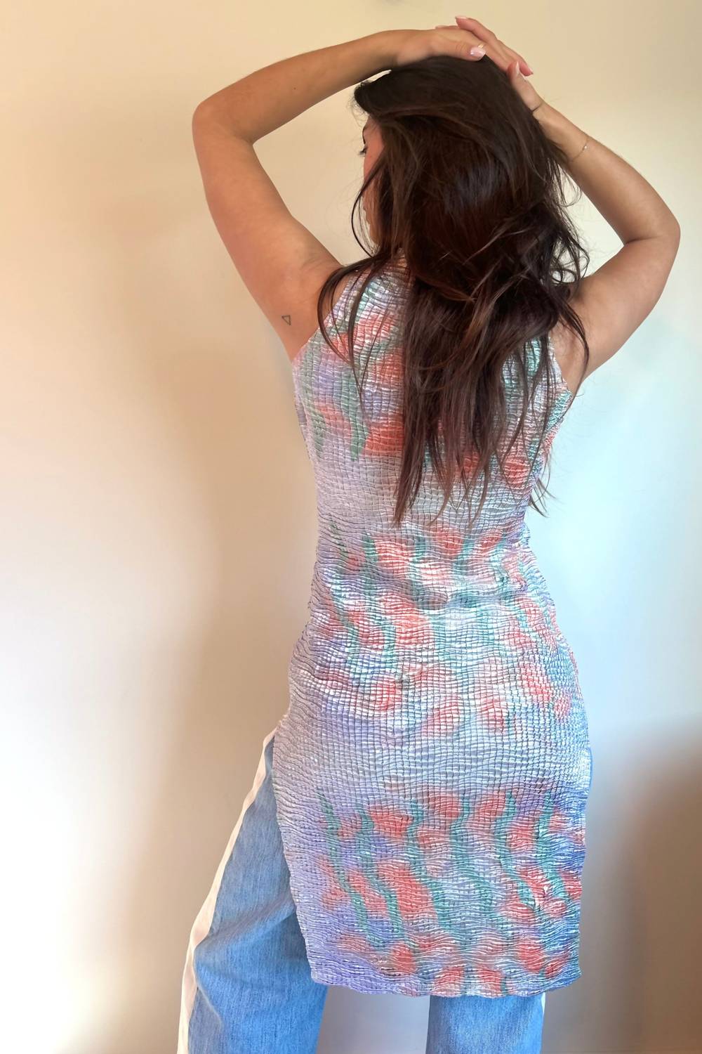 The perfect mini dress for those warmer months. Introducing the Skin Singlet Mini Dress by Nin Studio in a boho chic wax color, perfect for a stylish dinner party or New Year's Eve event. This sleeveless dress features a subtle mock neckline and a bodycon silhouette, crafted from 100% polyester dead-stock sourced locally in Mexico City. It's handmade with a unique double square pleat style and boasts a side open slit with a gracefully longer back. Closure: Pull on. Care: Hand-wash cold, delicate machine wash cold, lay flat to dry, do not bleach, do not iron, dry clean for longevity.