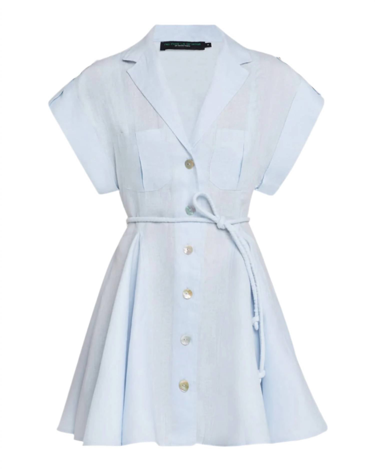 A short and breezy dress for those warmer days. Introducing the Women's Guayaba Dress by No Pise La Grama, a striking addition to your spring wardrobe. This sky blue dress features short sleeves with roll-tab cuffs and a stylish button-down front. The A-line silhouette coupled with a waist tie belt offers a flattering fit, while the notched collar and chest patch pockets add functional detail. Crafted from premium linen, this mini-length dress, imported for optimal quality, is perfect for dinner parties and New Year's Eve celebrations.