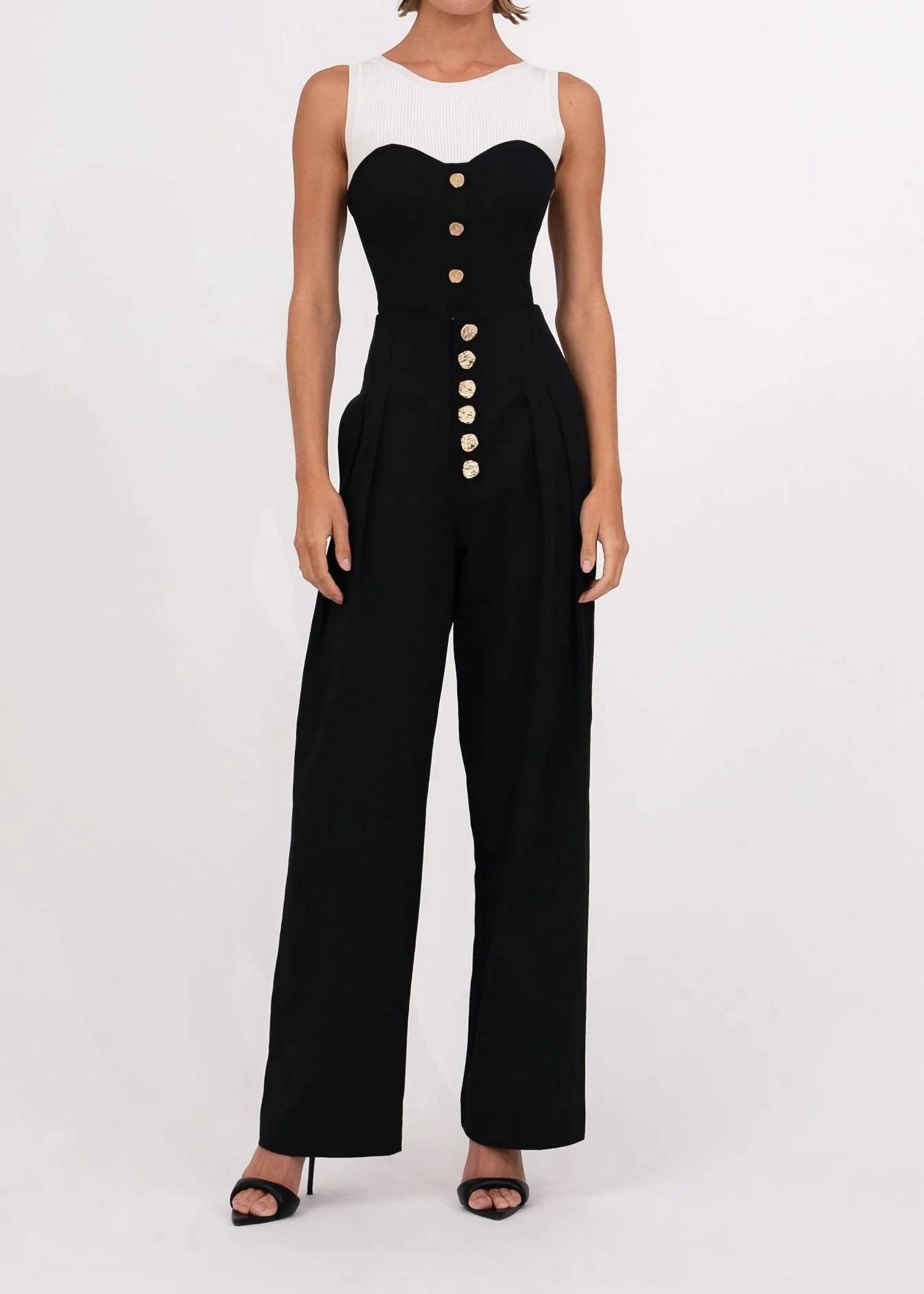This classic tank top is perfect for layering and cute enough to wear on its own. The Bowie Tank Top by Nonchalant Label is a sophisticated choice for any dinner party or New Year's Eve celebration. This sleeveless piece offers a distinct texture with a black and white pattern and features a ribbed knit crewneck for a flattering minimalist style. Made with careful attention to detail, it includes a zip closure down the center adorned with elegant gold buttons. For care, this top requires dry cleaning to maintain its pristine condition, and the model wears a size small (5'11" height).