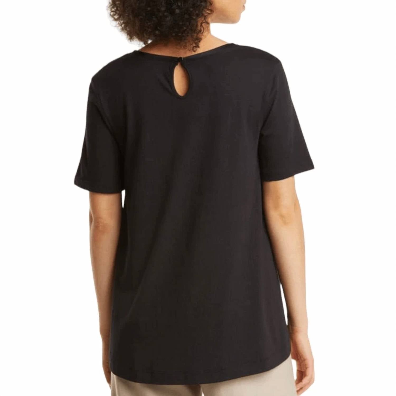 Pair this with your favorite jeans and slides for your next girls night out. Elevate your wardrobe with the Mixed Media Swing Short Sleeve Top by Nordstrom in a timeless black hue. Crafted from a blend of 51% recycled polyester and 49% polyester, this short-sleeve blouse offers a chic boatneck design perfect for any occasion. Originating from Vietnam, it features a convenient button closure. Care instructions include machine wash and lay flat to dry, ensuring easy maintenance.
