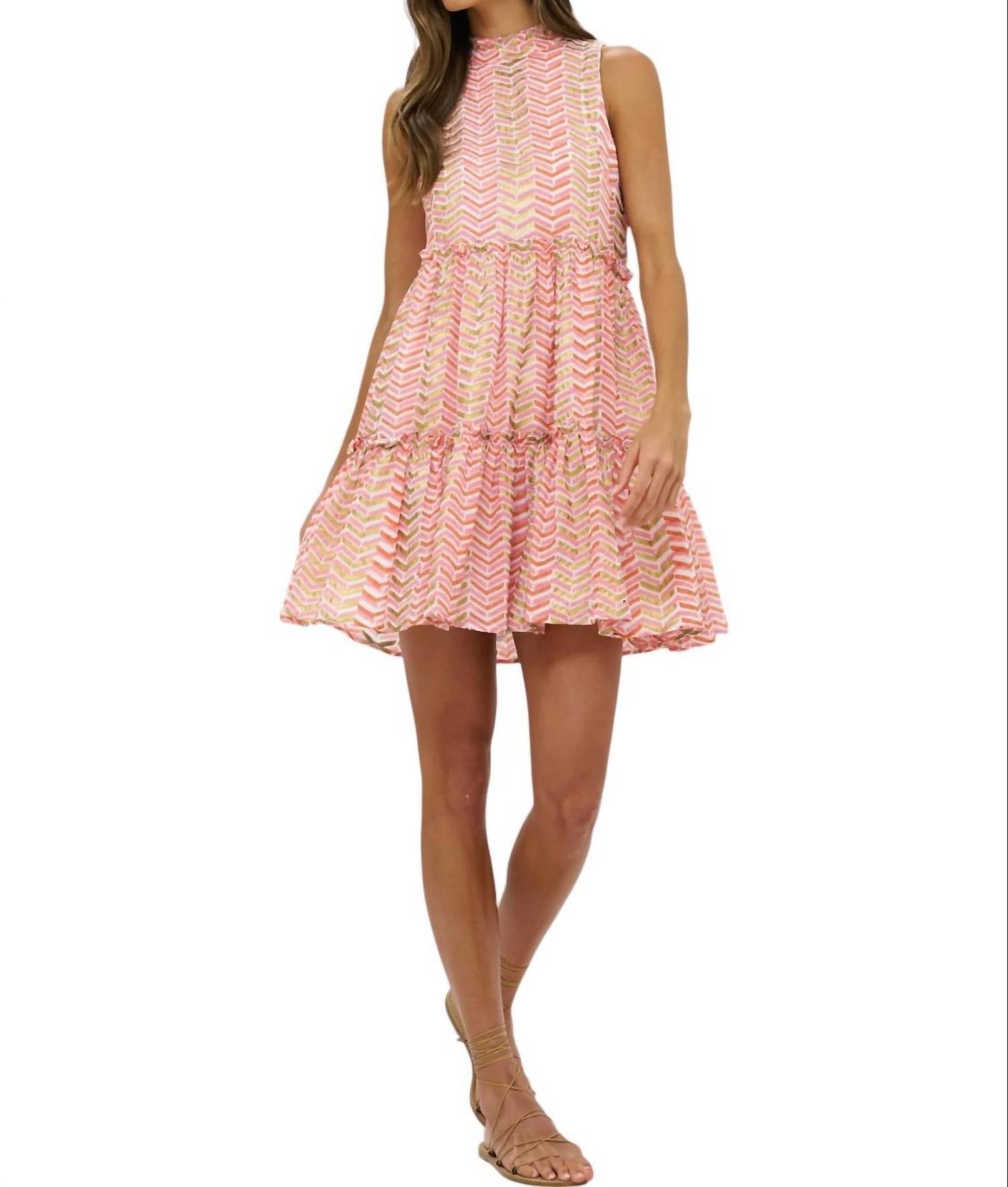 Introducing the Ruffle Tiered Short Dress by Oliphant, a delightful addition to your summer wardrobe in vibrant Sonoma Orange. This sleeveless, mini dress is crafted from hand block printed cotton voile, featuring exquisite gold paint detailing. It boasts a stylish ruffle neck and a sheath silhouette, with convenient button closures at the back of the neck in a pull-over style. Care for this dress by washing on a cold delicate cycle with gentle detergent, turning it inside out for extra protection, and lay it flat or hang it to dry.