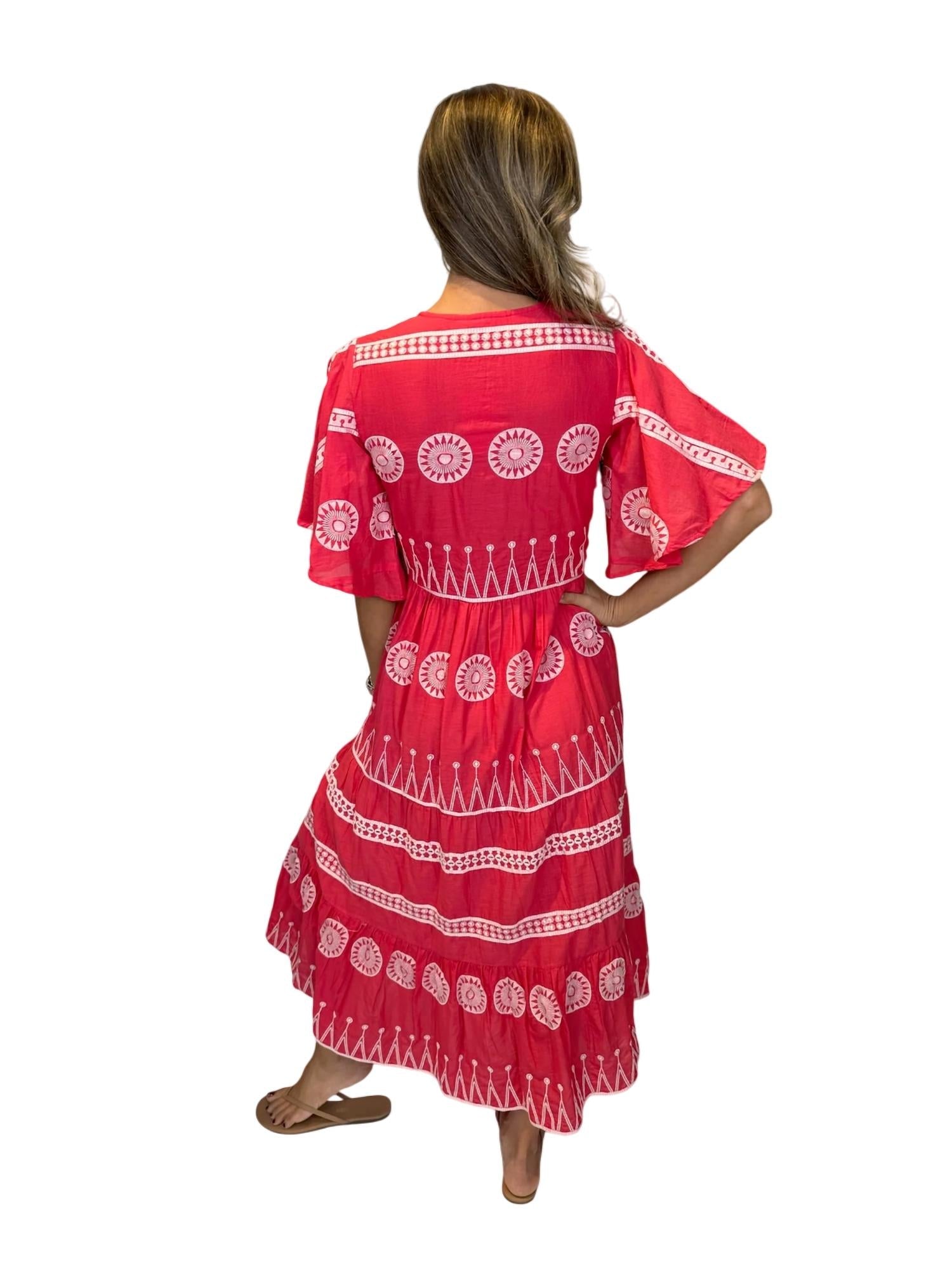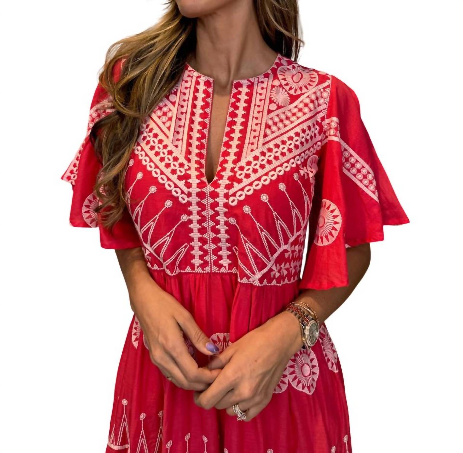 Who doesn't love a good maxi dress? This one you'll be reaching for season after season. Upgrade your wardrobe with the Oliphant V-Neck Maxi Dress, a stunning addition to any fashion-forward collection. This dress features a timeless A-line silhouette with short sleeves, made entirely of 100% cotton for comfort and breathability. The elegant hand embroidery adds a touch of sophistication, while the pull-on closure ensures ease of wear. Designed with practicality in mind, it includes convenient front pockets. Care: Hand wash cold separately. Model Alyssa is 5'10" and is wearing a size small.