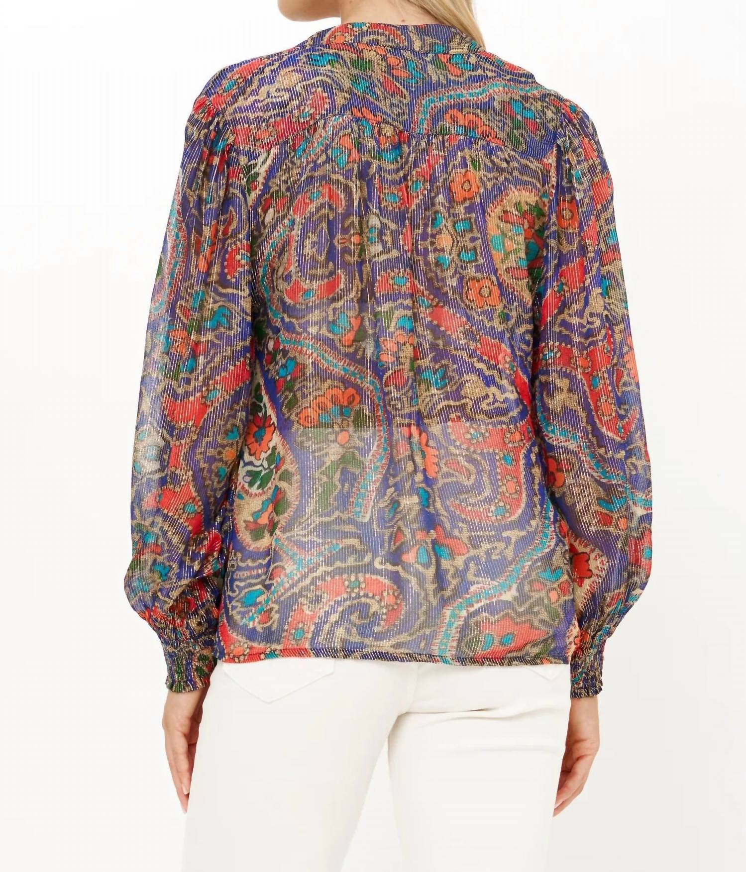 Pair this with your favorite jeans and slides for your next girls night out. Introducing the Women's Persia Pintuck Blouse by Oliphant, a stunning piece in a captivating cobalt floral pattern. Featuring long balloon sleeves and a V-neck with tie string closures, this blouse offers a feminine and sophisticated look. Made from luxurious georgette viscose with shimmering gold Lurex threads, this blouse is perfect for boho chic summer vacations. The pull-on style adds convenience, while the lining through the body ensures comfort.