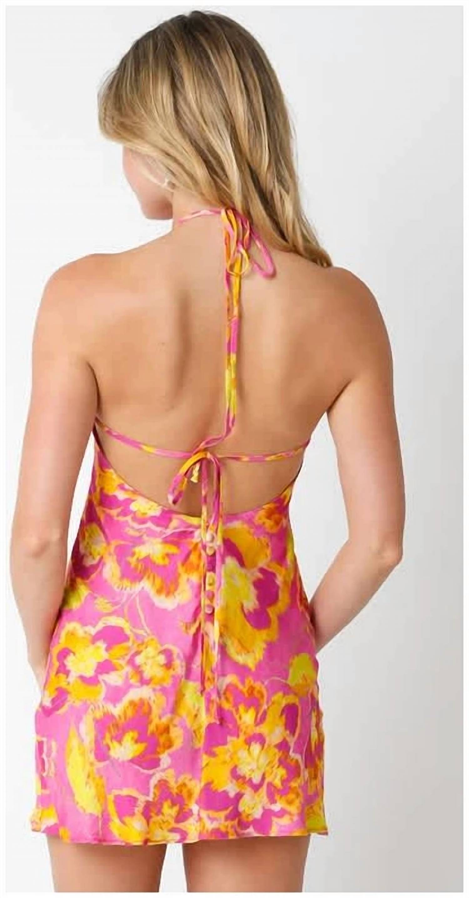 A short and breezy dress for those warmer days.Floral print. Halter neck. Mini dress. Sleeveless. Open back. Tie detail at back. 100% rayon.