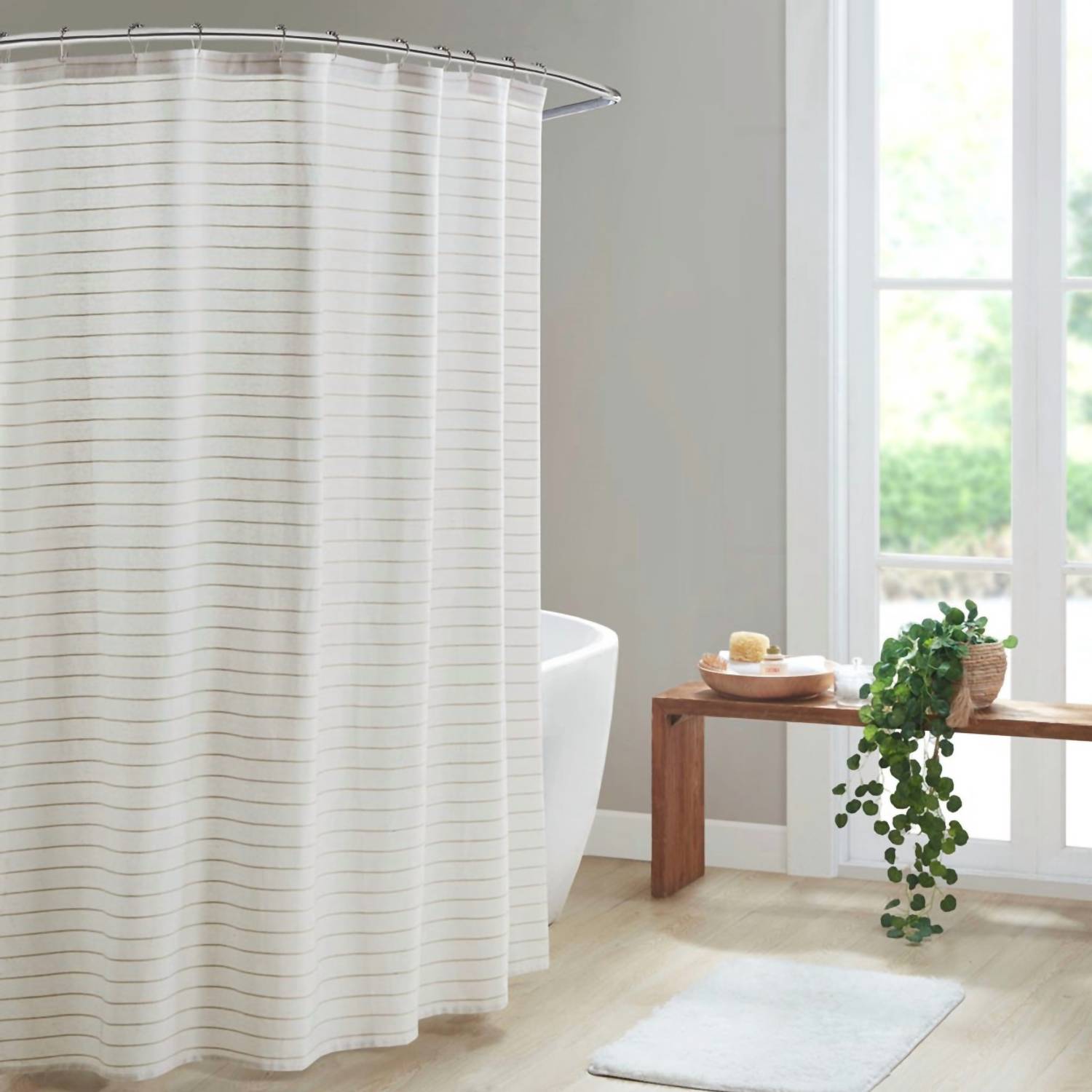 Classic shower curtain in linen like textured knit stripe. Materials: 100% Recycled Fiber Woven, 43% Cotton, 31% Polyester,13% Rayon,13% Acrylic. Machine washable. Dimension: 72" x 72".