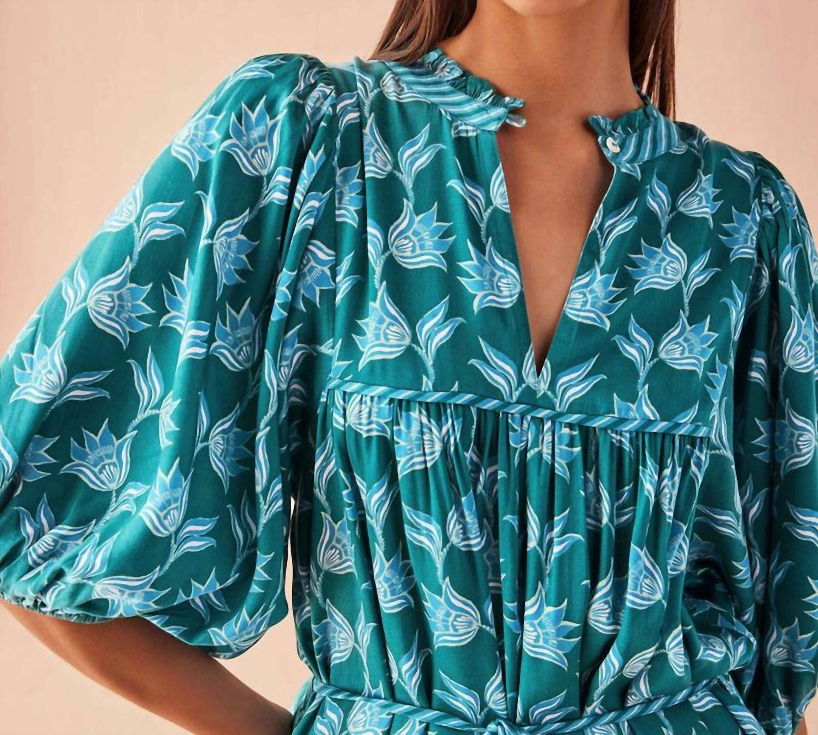 The kind of easy and flattering dress you'll be reaching for all season long. Introducing the Wren Mini by OMIKA, a charming addition to your wardrobe with its sophisticated and sweet aesthetic. This mini dress in Nicobar Mantis color boasts full sleeves with elastic openings, allowing you to push them up for added style. Crafted from 100% Modal, it features hourglass-enhancing details like a ruffled neckline, shirred body, and yoke detail at the chest. Closure is a button at the collarband, and the dress includes a separate belt for versatile styling. Length: 34" from size S. Care: Machine wash, line dry.