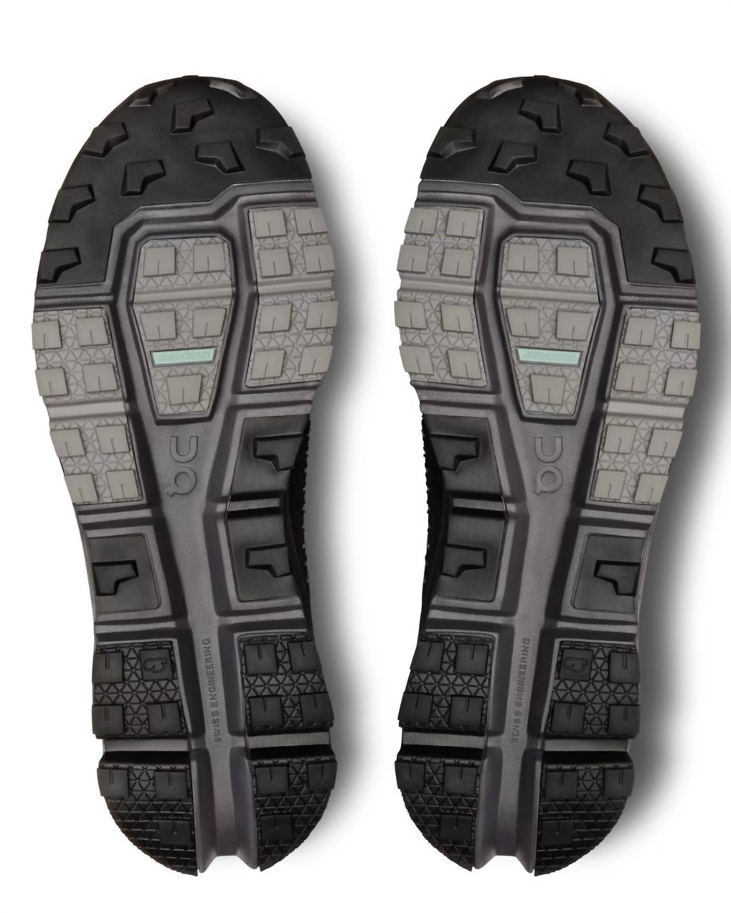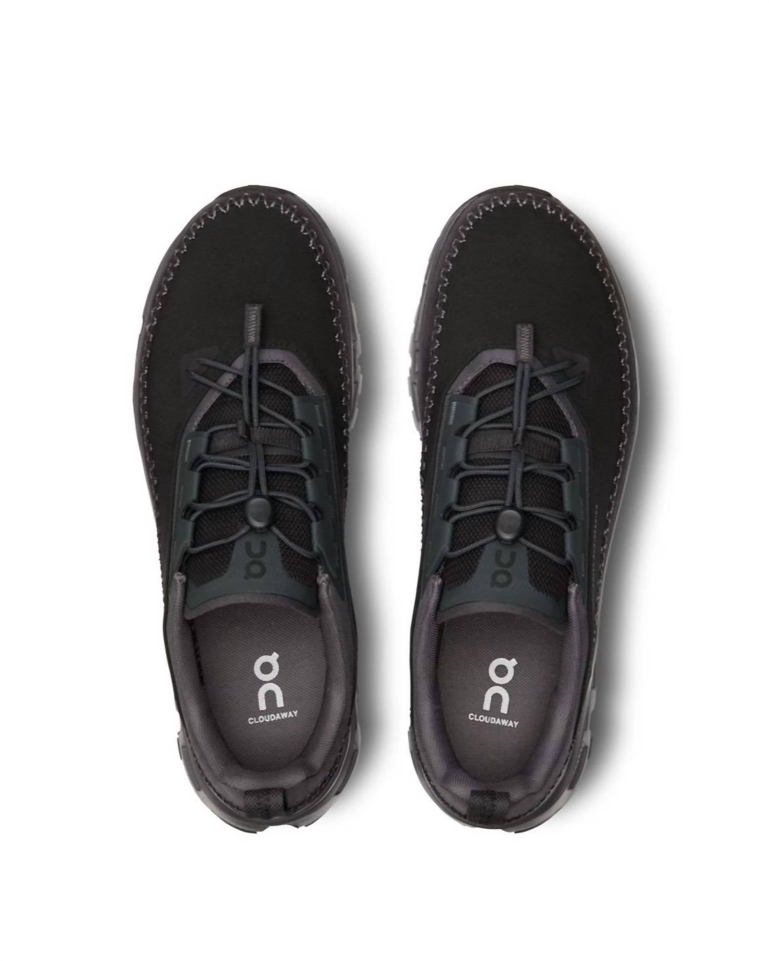 Experience limitless comfort and adventure with the Men's Cloudaway 2 Sneakers by On Cloud in sleek Black/Eclipse. Crafted with an ultra-lightweight mesh upper composed of over 90% recycled content, these sneakers promise breathability and a comfortable wear for all your expeditions. Featuring a round toe and flat heel, they are equipped with a single toggle lacing system for a customized fit, and a closed midsole to keep debris at bay. Designed with a 10% recycled rubber sole for minimal environmental impact, these sneakers are perfect for hiking and other outdoor occasions.