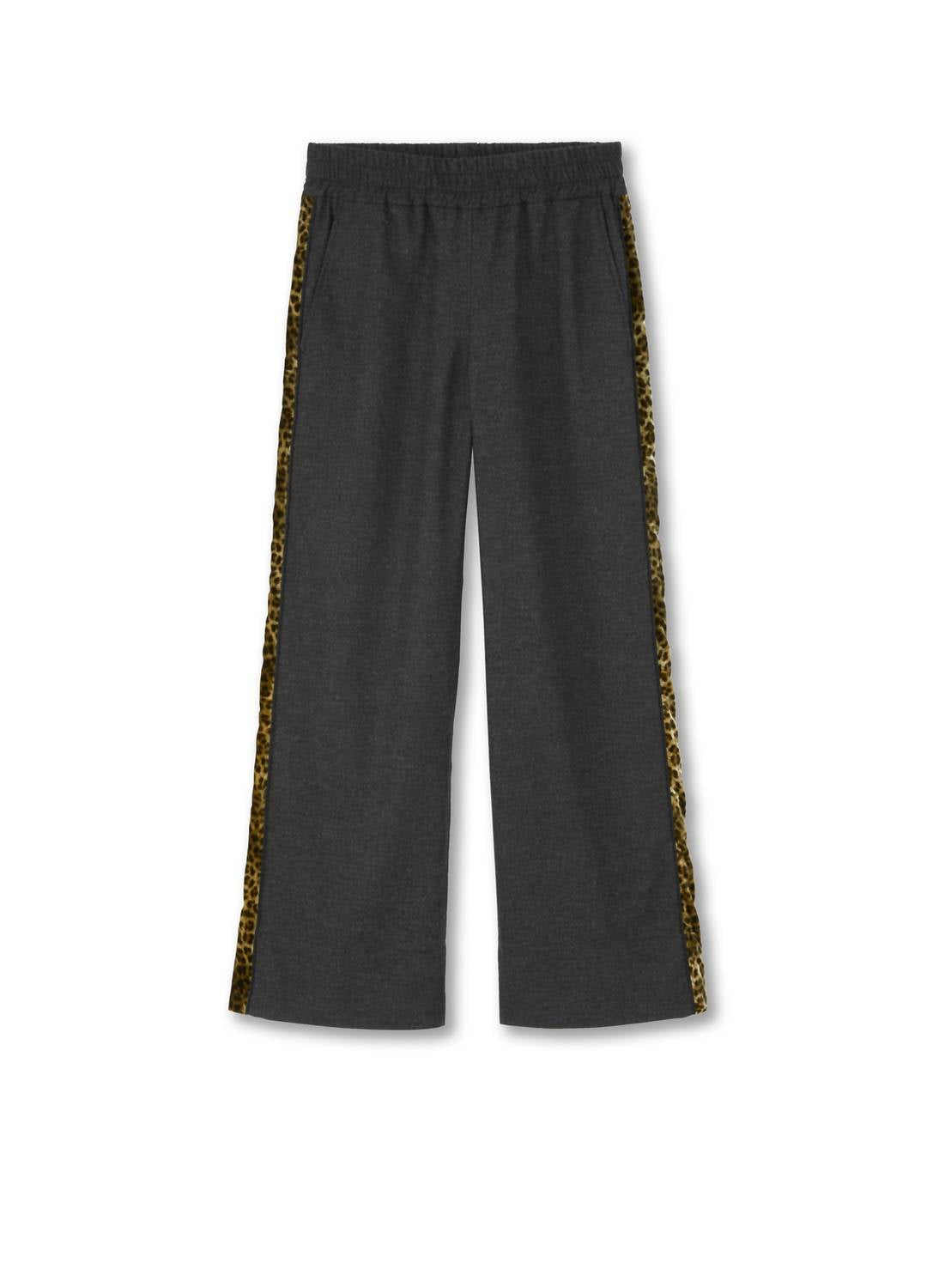 Designed for women who appreciate a perfect blend of style and functionality. These pants feature a wide leg and are crafted from a luxe wool blend, offering a subtle stretch for added comfort. They boast sporty side-stripe panels in animal print velvet, adding an unexpected and fashionable twist. Closure is easy with a pull-on design, complemented by practical pockets for convenience.