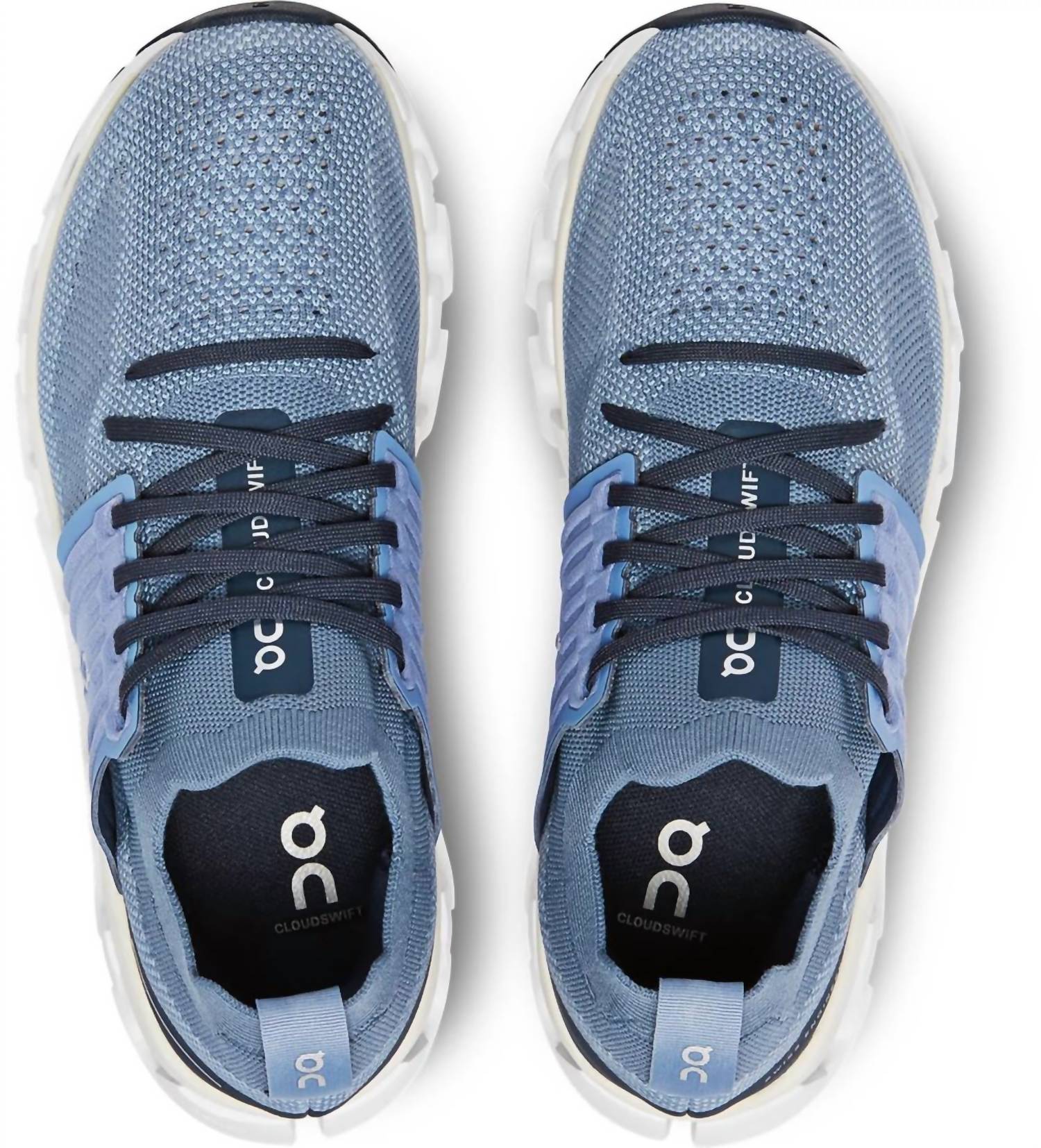 Workout in style with these adorable athletic sneakers. Discover the Women’s Cloudswift 3 - B Running Shoe by On, a perfect blend of comfort and style in metal and white. Crafted with an engineered zonal knit upper from 100% recycled polyester, it offers a sock-like fit and adaptable comfort for diverse foot shapes. The shoe features a re-engineered CloudTec® midsole with Helion™ superfoam for enhanced cushioning and a dynamic Speedboard® for a high-energy return. Embrace your urban adventures with these athleisure-inspired athletic shoes, ideal for summer travel and medium-width feet.