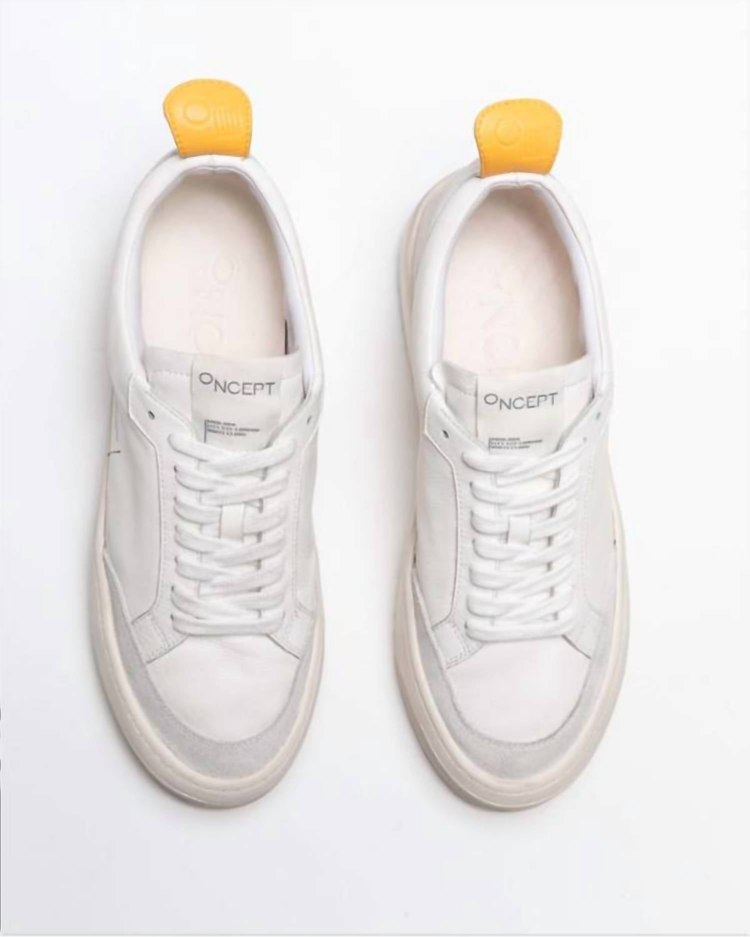 The Oncept Men London Sneaker is made of premium leather and features a round toe. It has a low platform heel measuring between 1 1/4 inches and 2 inches. The sneakers are designed for casual wear and provide comfort for everyday use.