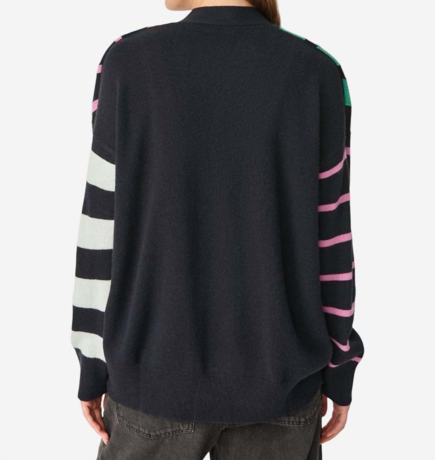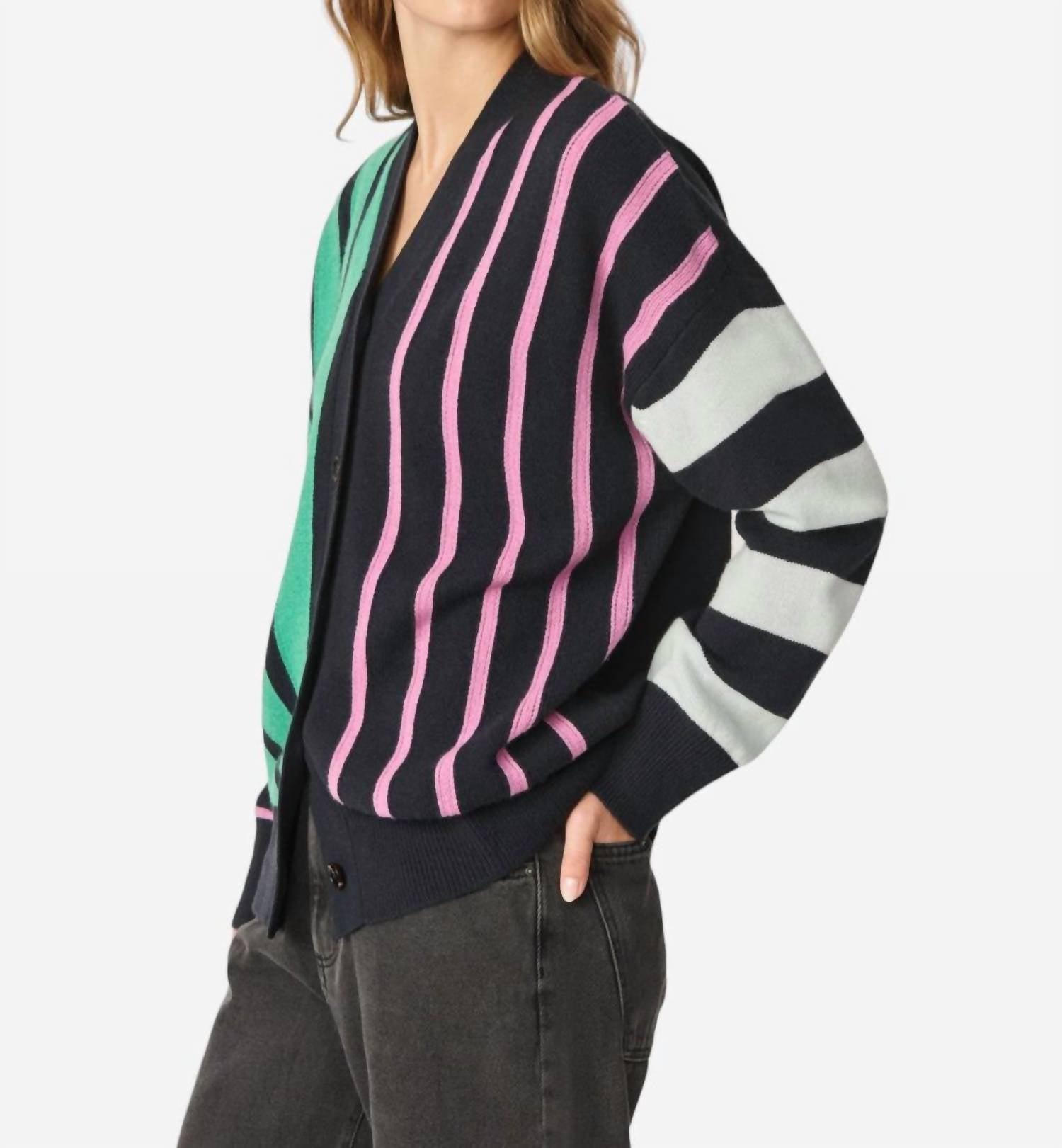 Introducing the Whitney Cardigan by Oncept, a bold statement piece in indigo stripe designed for the season. This long-sleeve cardigan is crafted from 100% ultrafine merino wool, offering a cozy and luxurious feel. Elevate your wardrobe with its graphic multi-stripe pattern and versatile button closure, perfect for layering during the fall. Care instructions include dry cleaning or hand washing and laying flat to dry.