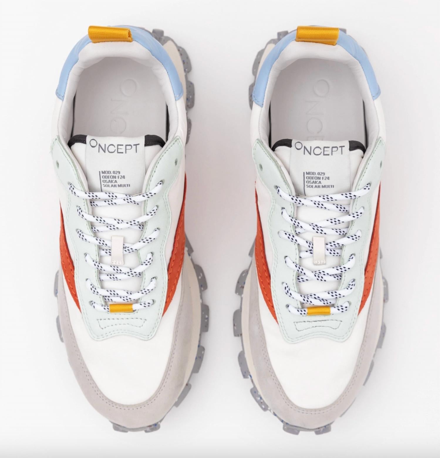 Get your daily steps in with these adorable sneakers. Meet the Women's Osaka Elite Trainer by Oncept, redefining style in Solar Multi. This sneaker boasts a Varsity Re-Nylon upper paired with chrome-free suede, supported by an EVA platform midsole and oversized lug bottom. The interior features a Tencel pulp-based twill lining and a leather sock for optimal comfort. Care involves gently wiping the upper with a damp cloth and cleaning the outsole with a soft cloth and water. Designed with a 1.5-inch heel height, these trainers run true to size, ensuring both comfort and a perfect fit.