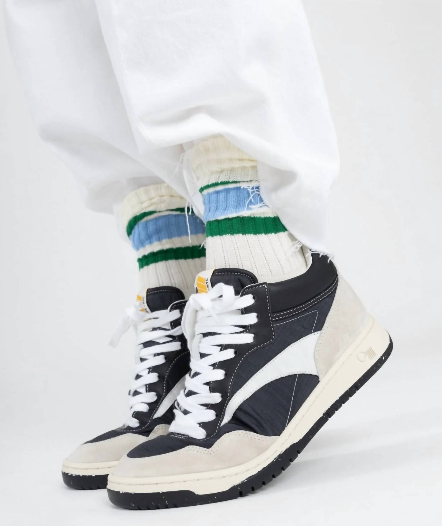 Get your daily steps in with these adorable sneakers. Introducing the Women's Princeton Mid-top Sneaker by Oncept, a perfect harmony of courtside and street style. Crafted from a nylon blend and signature calf leathers, these mid-top sneakers feature a distinctive two-tone recycled rubber bottom, ideal for a chic and adaptable look. With a versatile black finish, they effortlessly elevate any wardrobe while maintaining a modern streetwear edge. Designed with a comfortable round toe, these sneakers cater to the fashion-forward adult woman.
