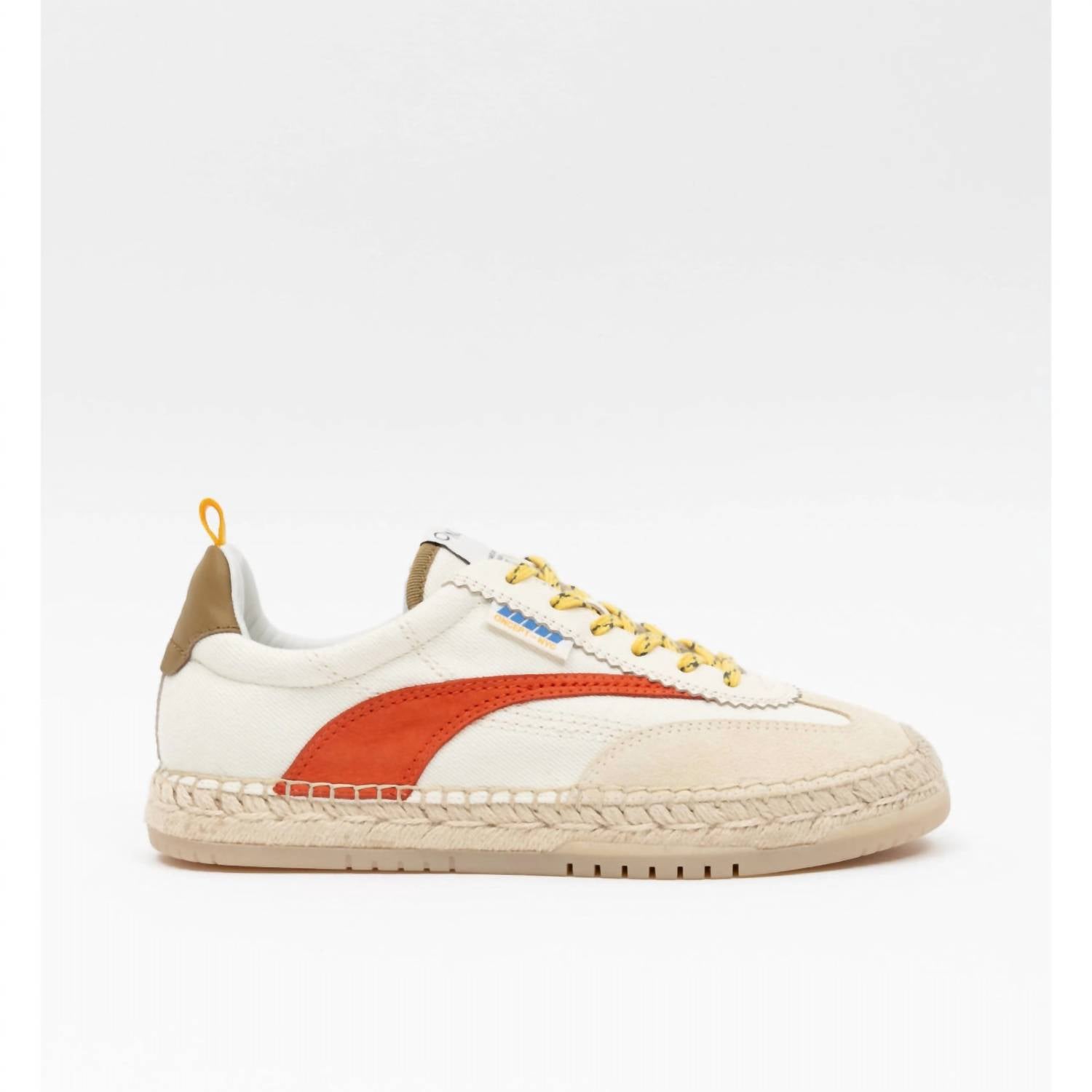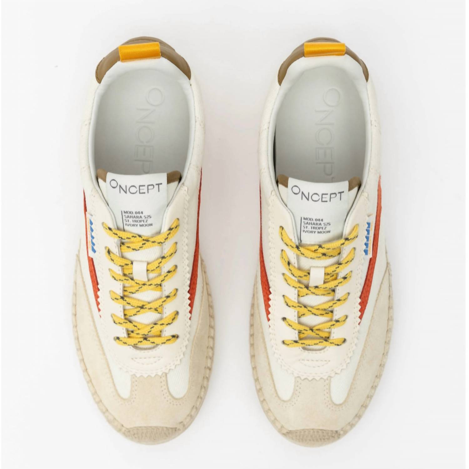 Experience the perfect blend of laid-back style and effortless elegance with the Women's St Tropez Sneaker by Oncept. This sneaker-espadrille hybrid in Ivory Moon features a flexible canvas and leather upper, complemented by a recycled rubber outsole, promoting both comfort and eco-conscious living. Designed with a round toe and low heel height of 1 1/4" to 2", it is ideal for both beach trips and city outings. The St Tropez Sneaker includes additional tonal laces for versatile styling.