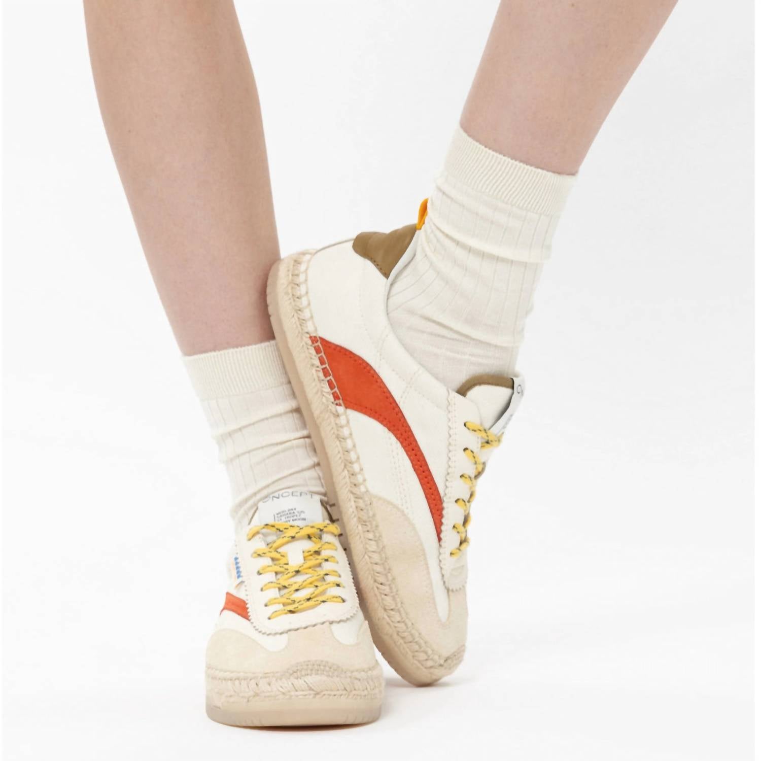 When fashion and function come together seamlessly. Experience the perfect blend of laid-back style and effortless elegance with the Women's St Tropez Sneaker by Oncept. This sneaker-espadrille hybrid in Ivory Moon features a flexible canvas and leather upper, complemented by a recycled rubber outsole, promoting both comfort and eco-conscious living. Designed with a round toe and low heel height of 1 1/4" to 2", it is ideal for both beach trips and city outings. The St Tropez Sneaker includes additional tonal laces for versatile styling.