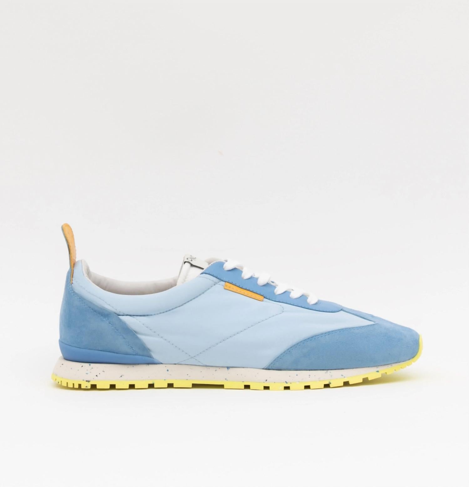 Get your daily steps in with these adorable sneakers. The Women's Tokyo Sneaker by Oncept is a quintessential travel companion, offering a fusion of retro styling with modern practicality. Crafted in Sky Light Blue, this sneaker features plush recycled water-resistant nylon, chrome-free suede, and Tencel twill linings, making it Oncept's most sustainable style yet. Designed with a round toe and a flat heel under 1", the shoe includes a bio-density recycled molded footbed and re-speckled EVA bottoms for ultimate comfort and support. Care for your sneakers by gently wiping the upper with a damp cloth and cleaning the outsole with a soft cloth and water, but avoid machine washing. Perfect for the modern muse on the go, this shoe is part of the Streetwear trend and ideal for travel in summer.