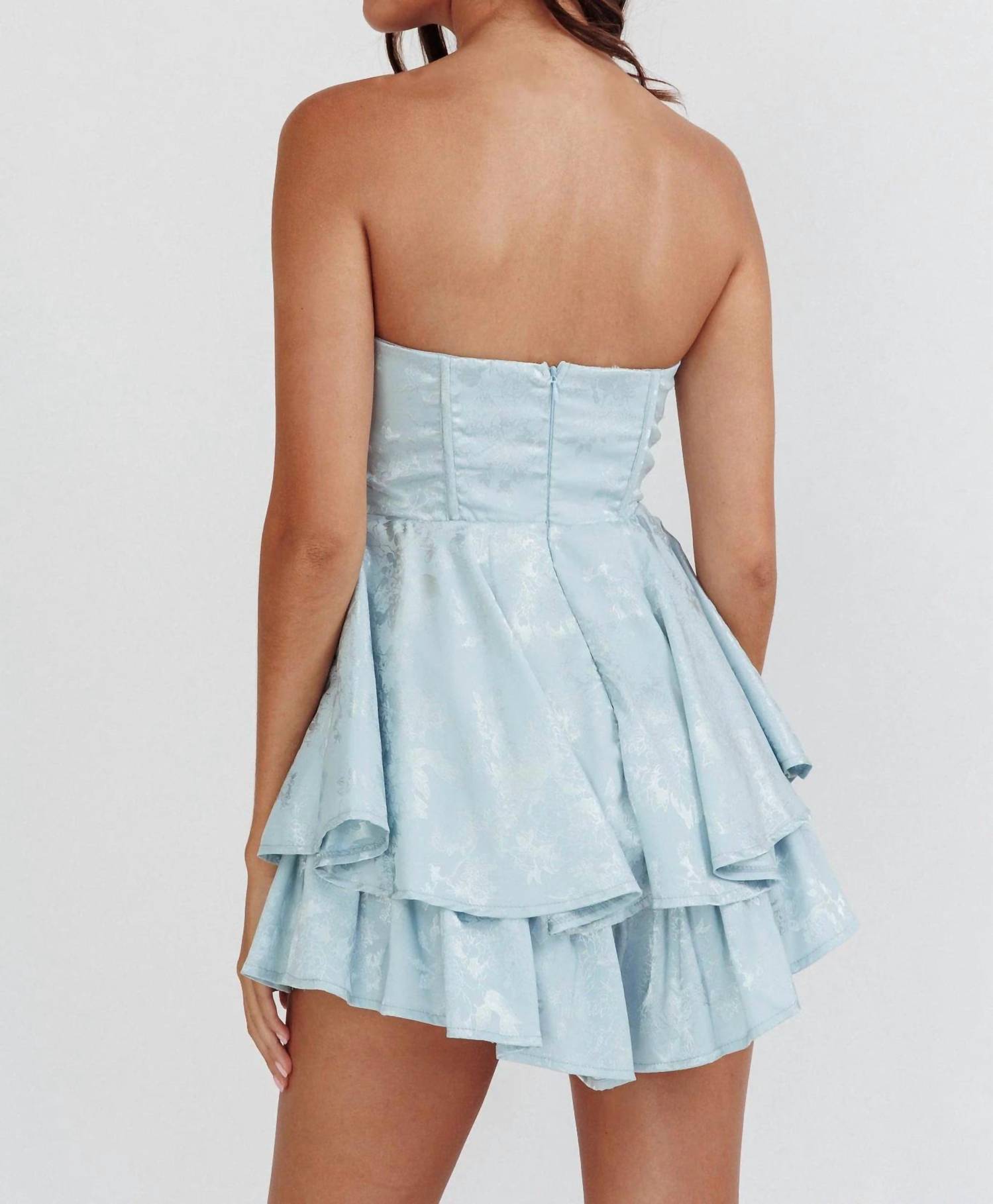 Elevate your summer style with the Strapless Corset Romper by One & Only, featuring a charming baby blue floral print. This romper highlights a strapless, open-back design with a lined and padded bust and structured fit. Composition: 100% Polyester. Closure: Zip closure. Care: Hand wash with cold water. Model is wearing an XS.