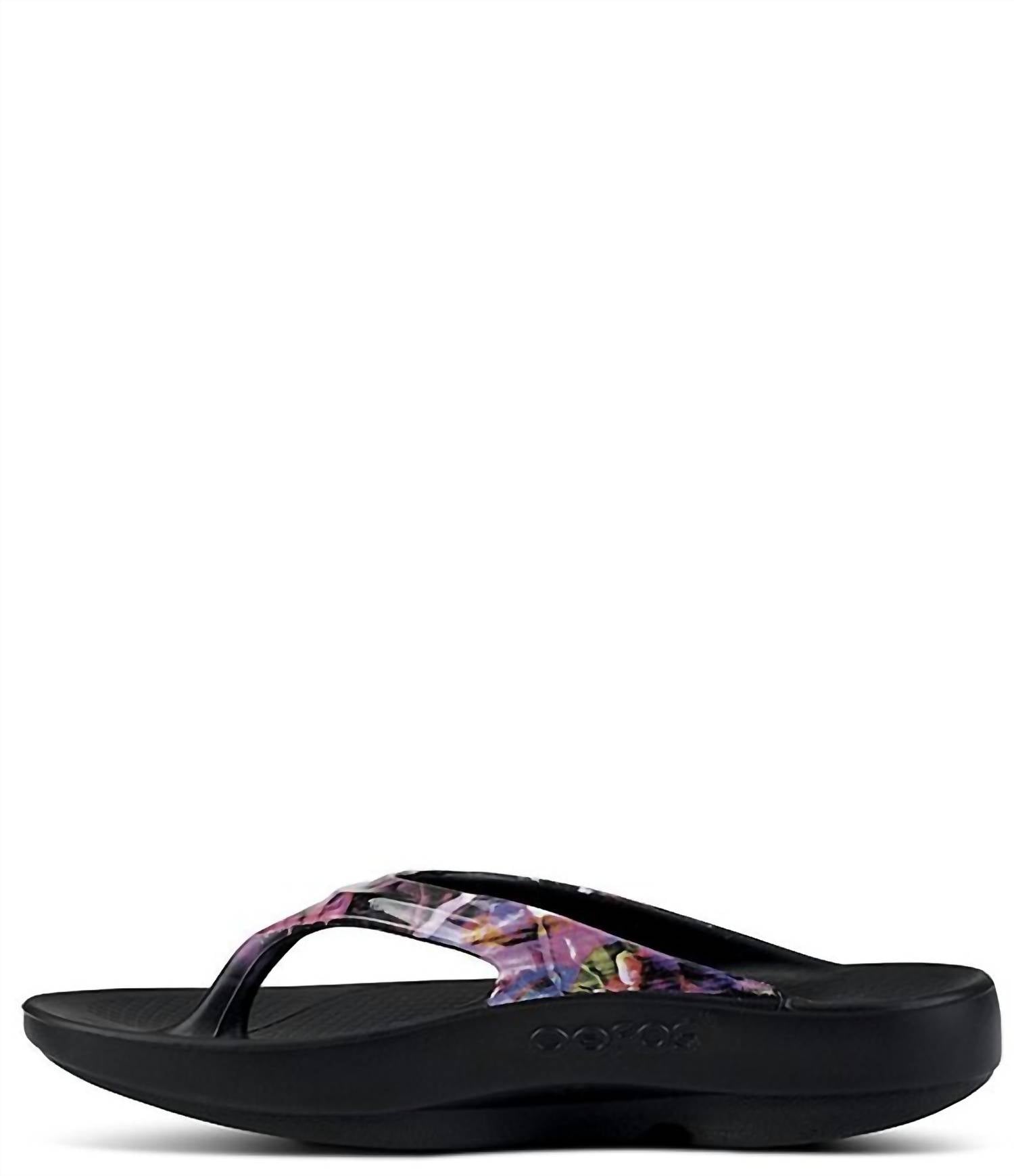 Step into comfort with the Women's Oolala Limited Thong Sandals by OOFOS, featuring OOfoam® technology that absorbs 37% more impact for superior cushioning. These Neone Rose sandals boast a hand-painted print and a tread-patterned foam outsole for enhanced motion and stability. Designed to reduce stress on knees and joints, the proprietary footbed cradles your arches, while the round toe and 1.5" wedge heel offer stylish and supportive wear. Made with closed-cell foam that's machine washable, they keep odors at bay during every adventure. Imported.