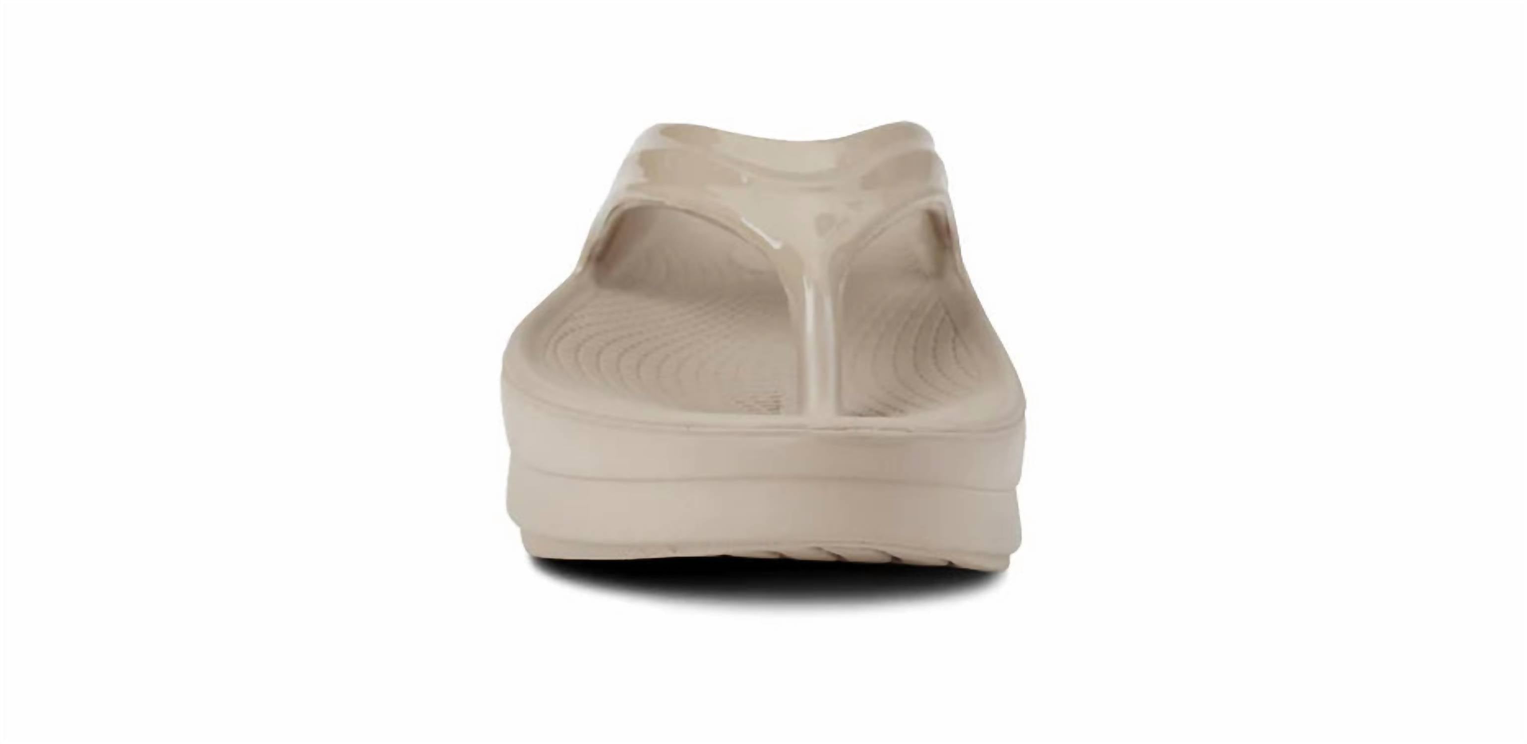 Classicly cute and all-day-wearable. We love this sandal. Introducing the Women's Oomega Oolala Sandal by OOFOS, a chic platform heel designed for trend-setting recovery. Made from durable rubber in an eye-catching Nomad color, this sandal features OOfoam™ technology, which absorbs 37% more impact than traditional footwear, and a patented footbed that reduces stress on joints. Perfect for summer fitness or workout activities, it combines modern athleisure style with essential foot support. Easy to care for, its closed-cell foam is machine washable and odor-resistant, ensuring longevity and freshness.