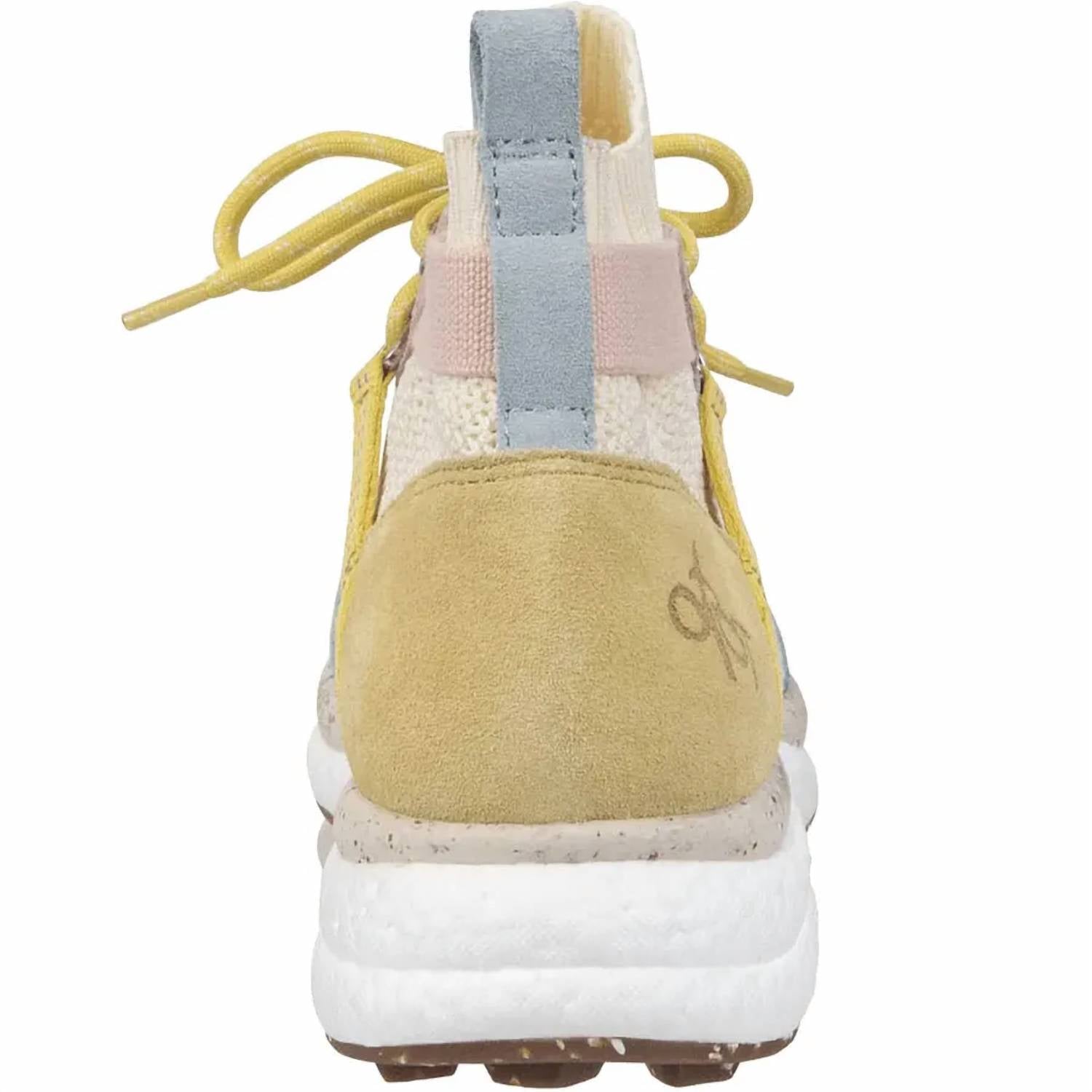 Introducing the Women's Hybrid Sneakers by OTBT, crafted with a breathable stretch knit and a wild mix of leathers and prints. These sneakers feature a soft sock-like high top, a round toe, and a sporty outdoor utility style. Engineered for ultimate comfort with Travel Lite® Step Lite foam and a removable EVA footbed, they boast a 1.77" platform heel and a 1.1" platform. Originating from China, they slip on easily with bicolor hiker laces and a recycled rubber lug sole, perfect for adventurous fall outings.