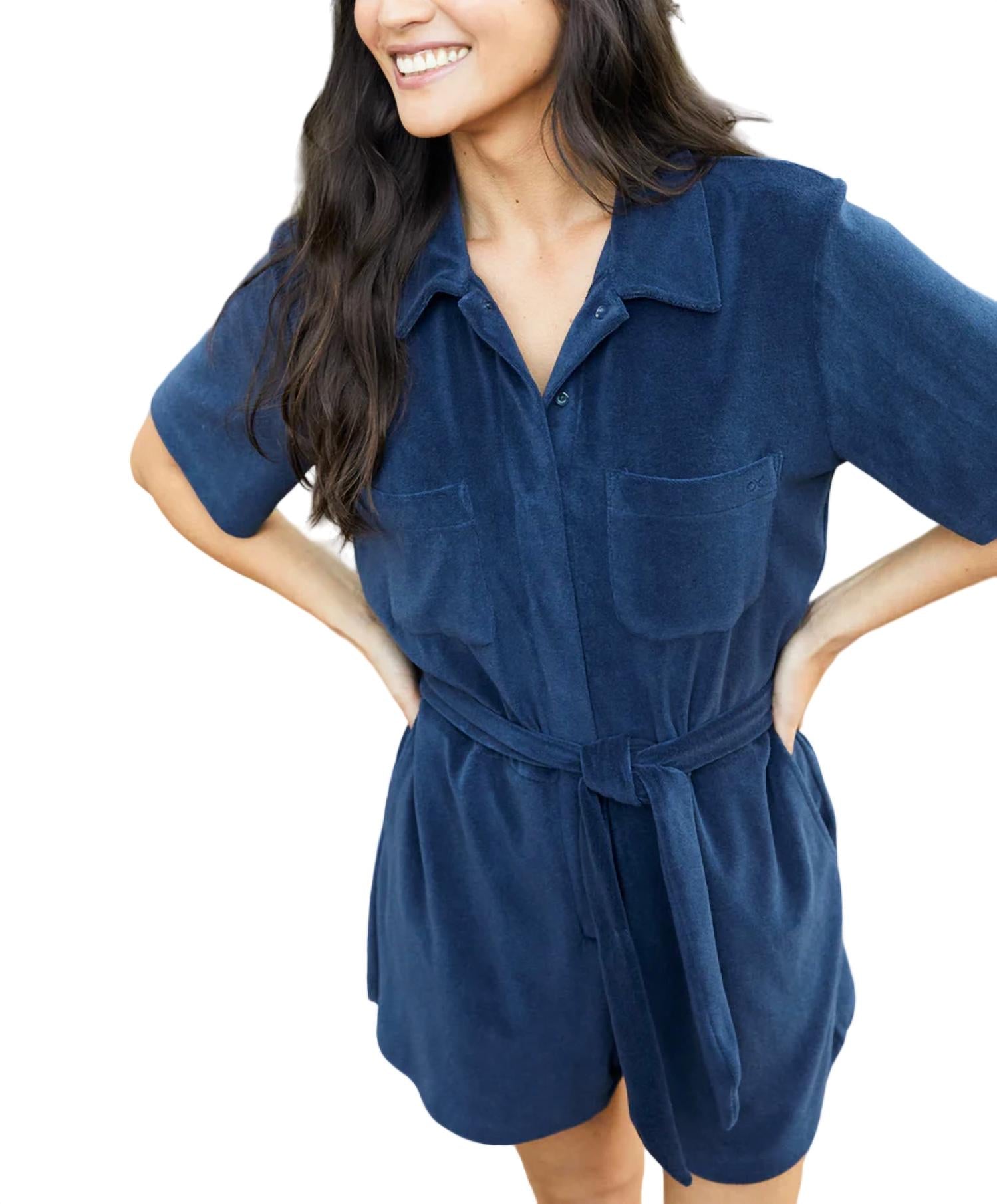 Throw it on and go!Soft terry with a smooth interior. Hidden snap-front placket with spread collar. Chest patch pockets, self-tie belt at waist, slant pockets. 17 3/4" Bodice length. 2 3/4" Inseam. 12 3/4" Leg opening. Machine wash cold. 57% Recycled polyester, 43% Organic cotton.
