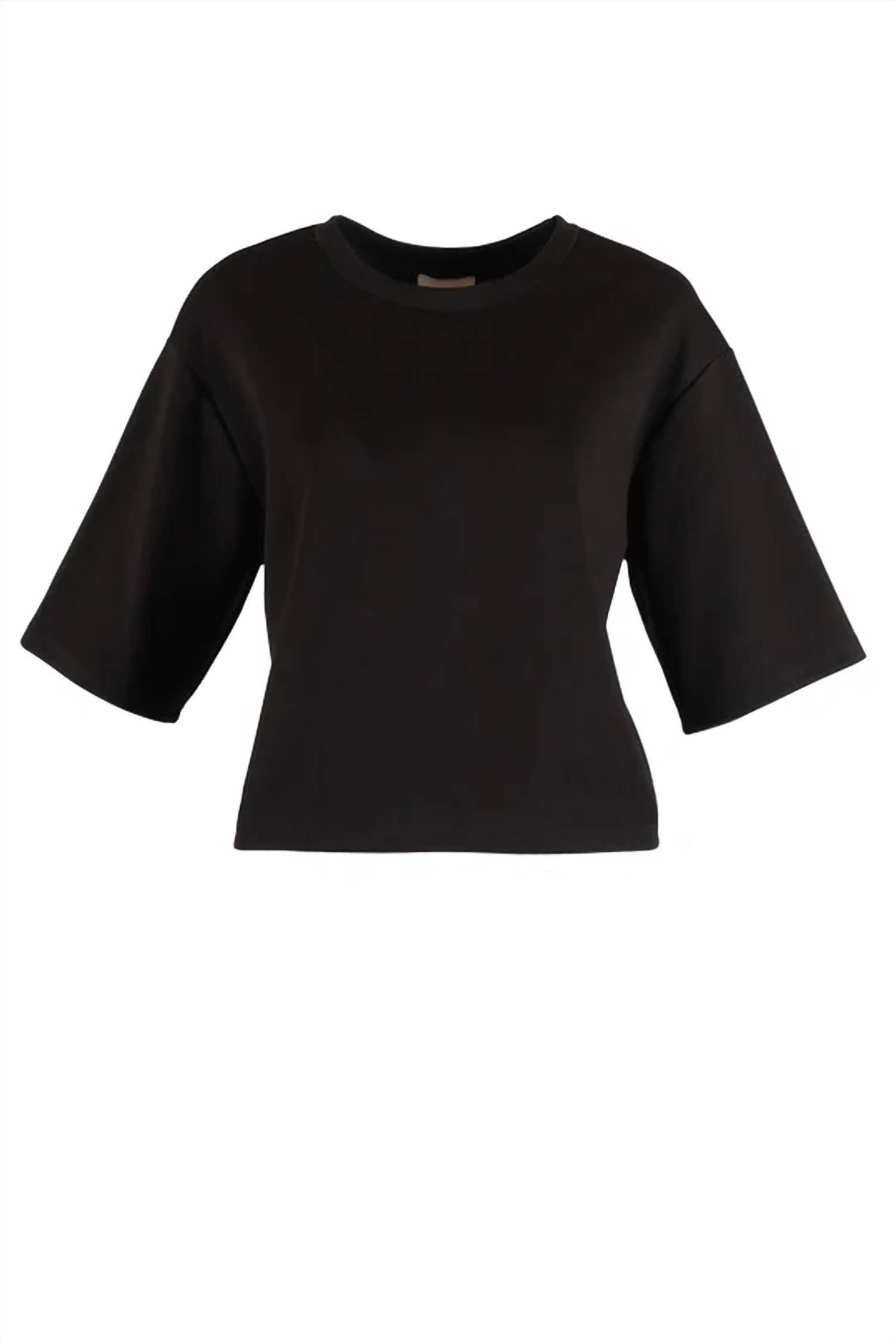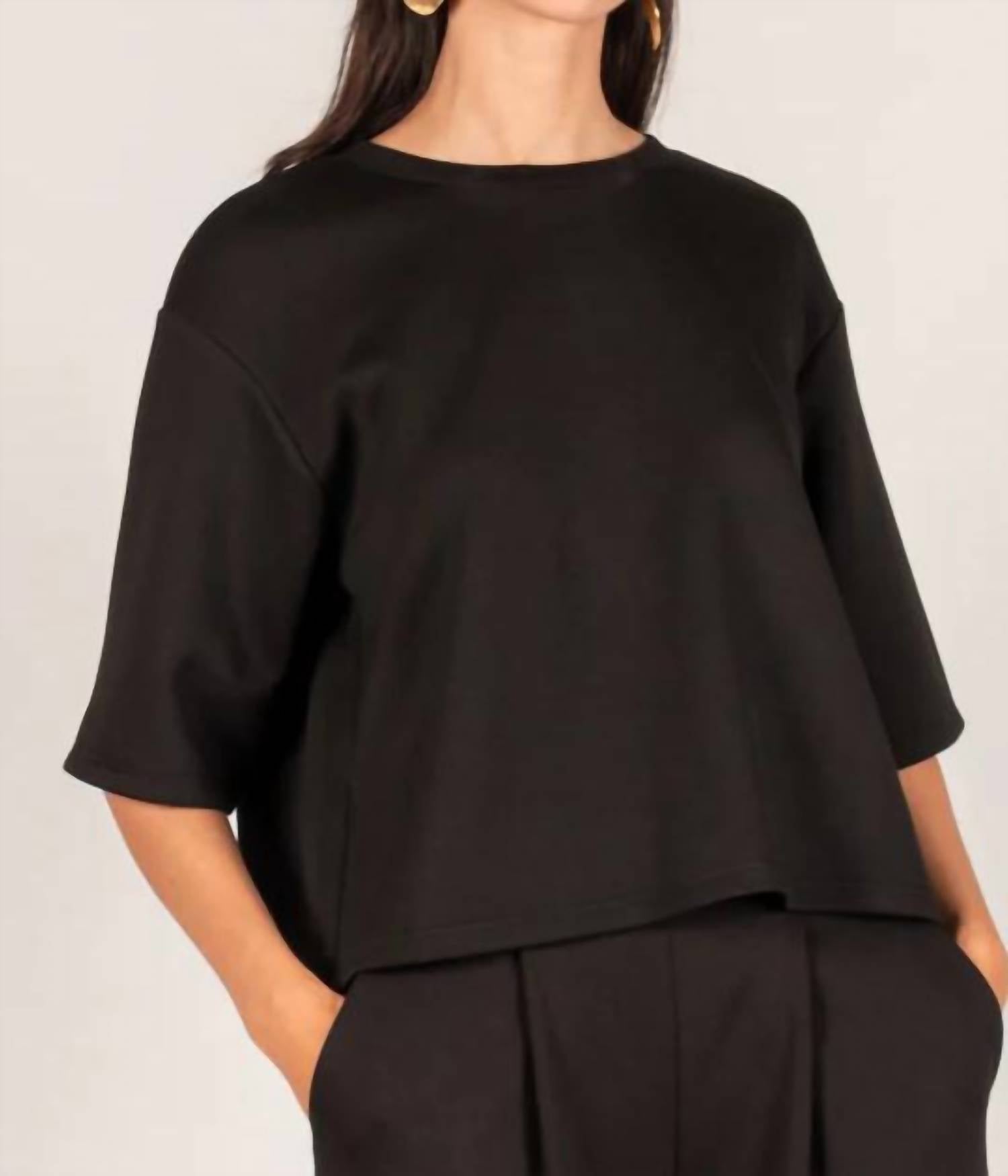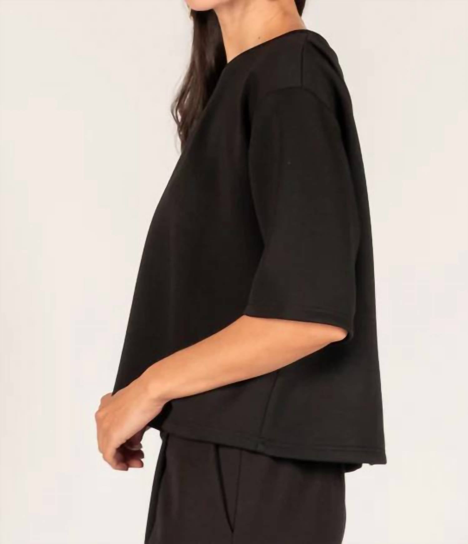 This classic, short sleeve tee will be your go-to staple this season and beyond. Classic black tee designed with a contemporary twist. Features three-quarter sleeves and a unique overlap cross back. Providing a boxy, relaxed fit. Breathable and soft yet structured. Crafted from a blend of 48% Modal, 48% Polyester, and 4% Spandex. Offers a perfect balance of comfort and style with a round neckline. Closure is a simple pull-on. For care, it can be machine washed or hand washed gentle, cold or warm, then hang dried. Runs true to size, possibly slightly larger.