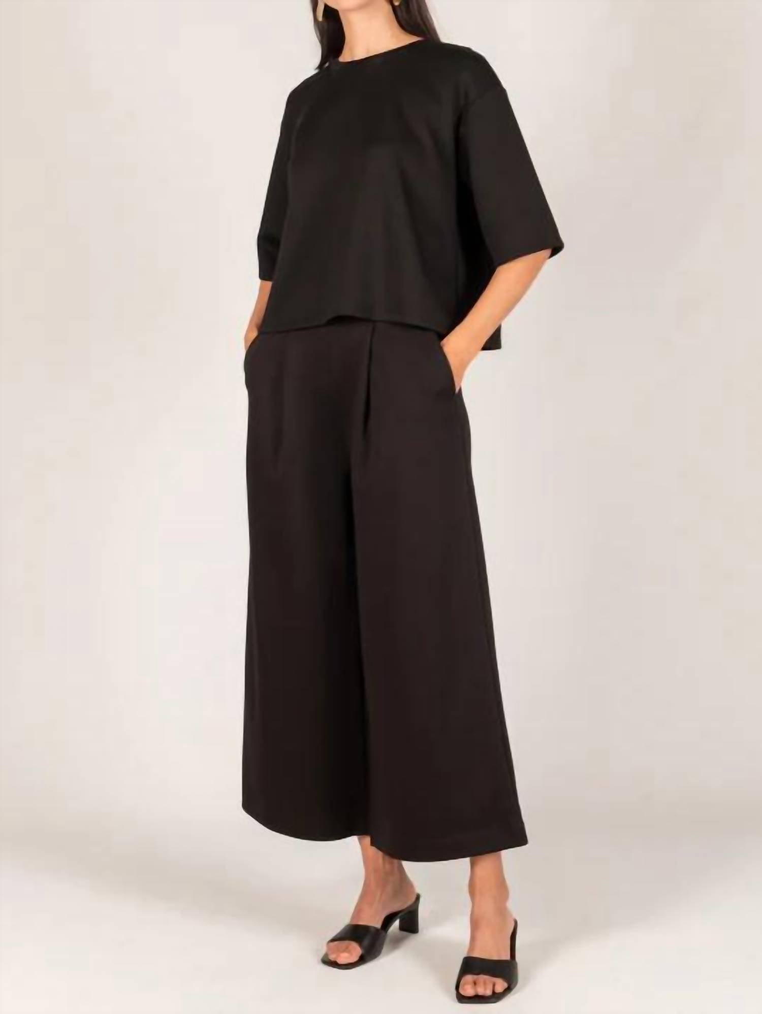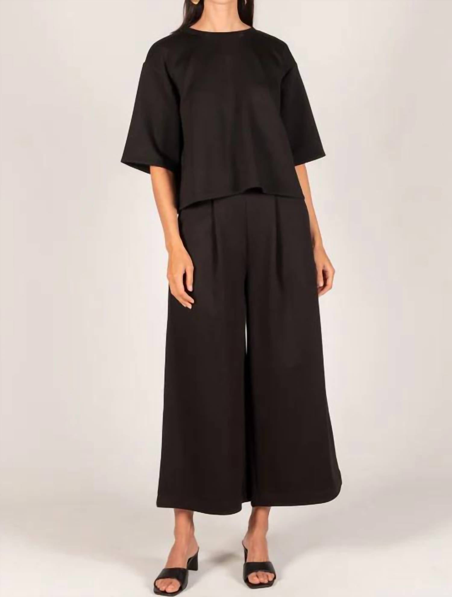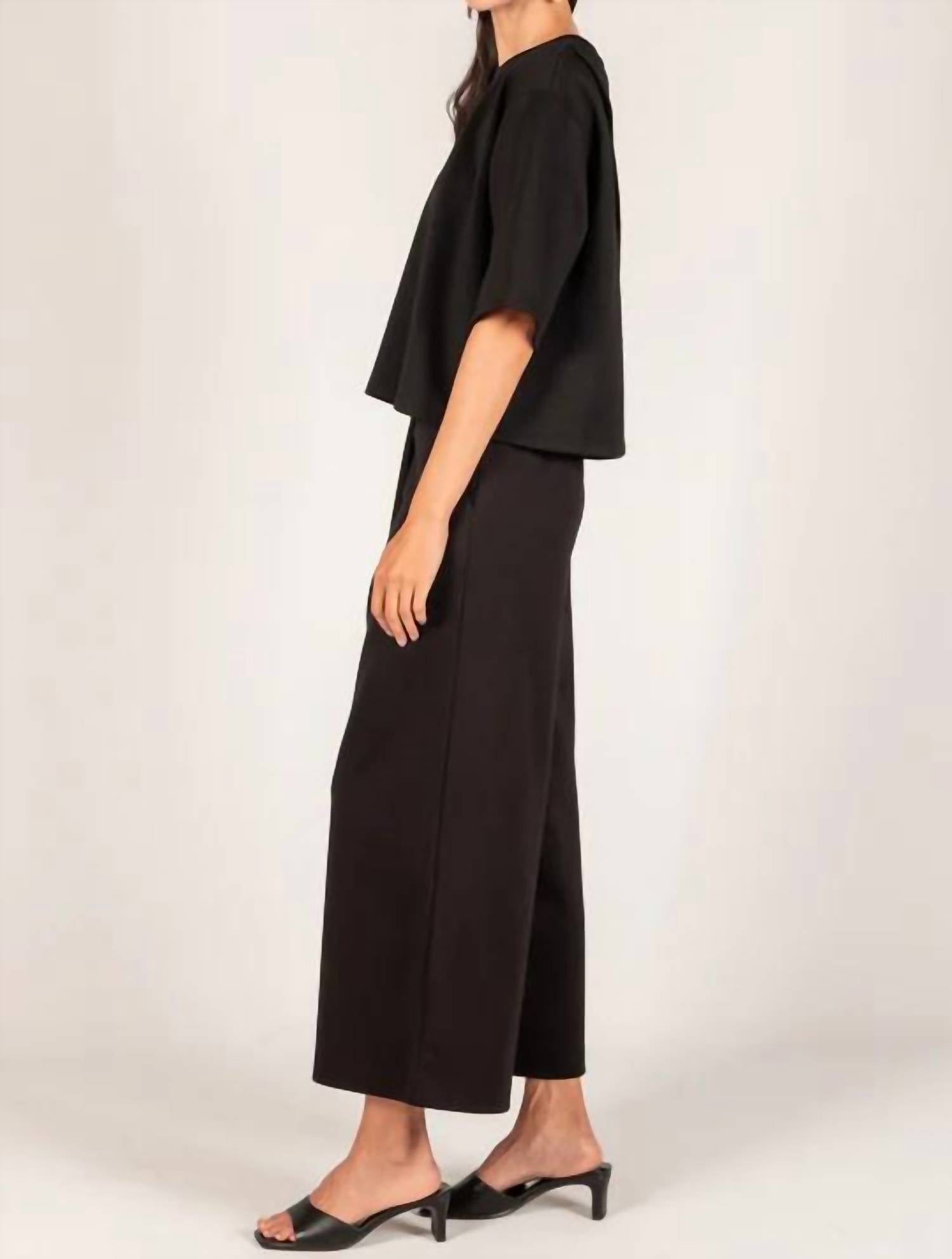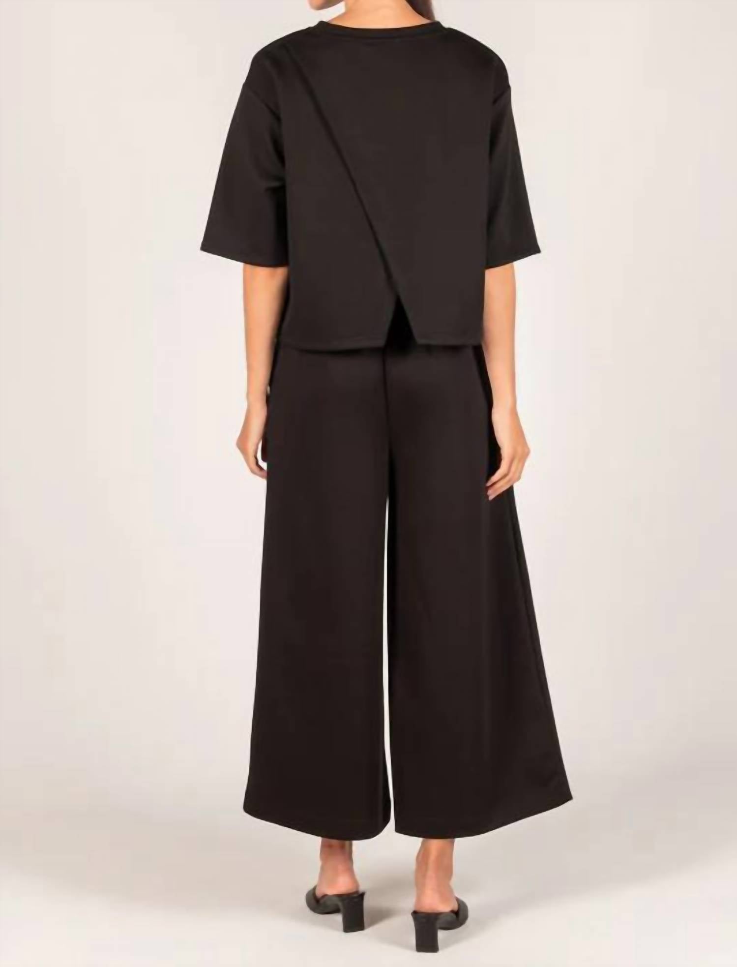 This classic, short sleeve tee will be your go-to staple this season and beyond. Classic black tee designed with a contemporary twist. Features three-quarter sleeves and a unique overlap cross back. Providing a boxy, relaxed fit. Breathable and soft yet structured. Crafted from a blend of 48% Modal, 48% Polyester, and 4% Spandex. Offers a perfect balance of comfort and style with a round neckline. Closure is a simple pull-on. For care, it can be machine washed or hand washed gentle, cold or warm, then hang dried. Runs true to size, possibly slightly larger.