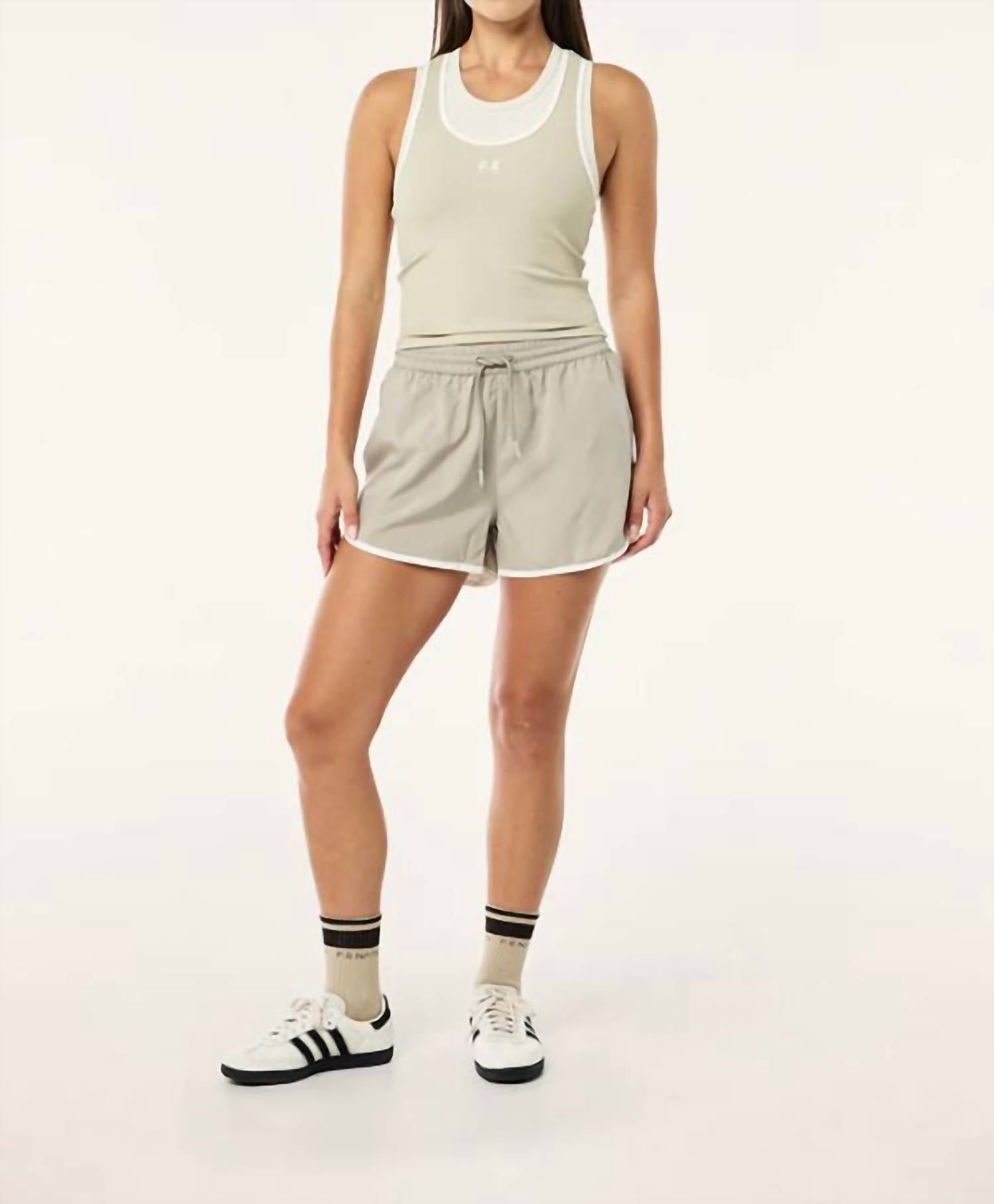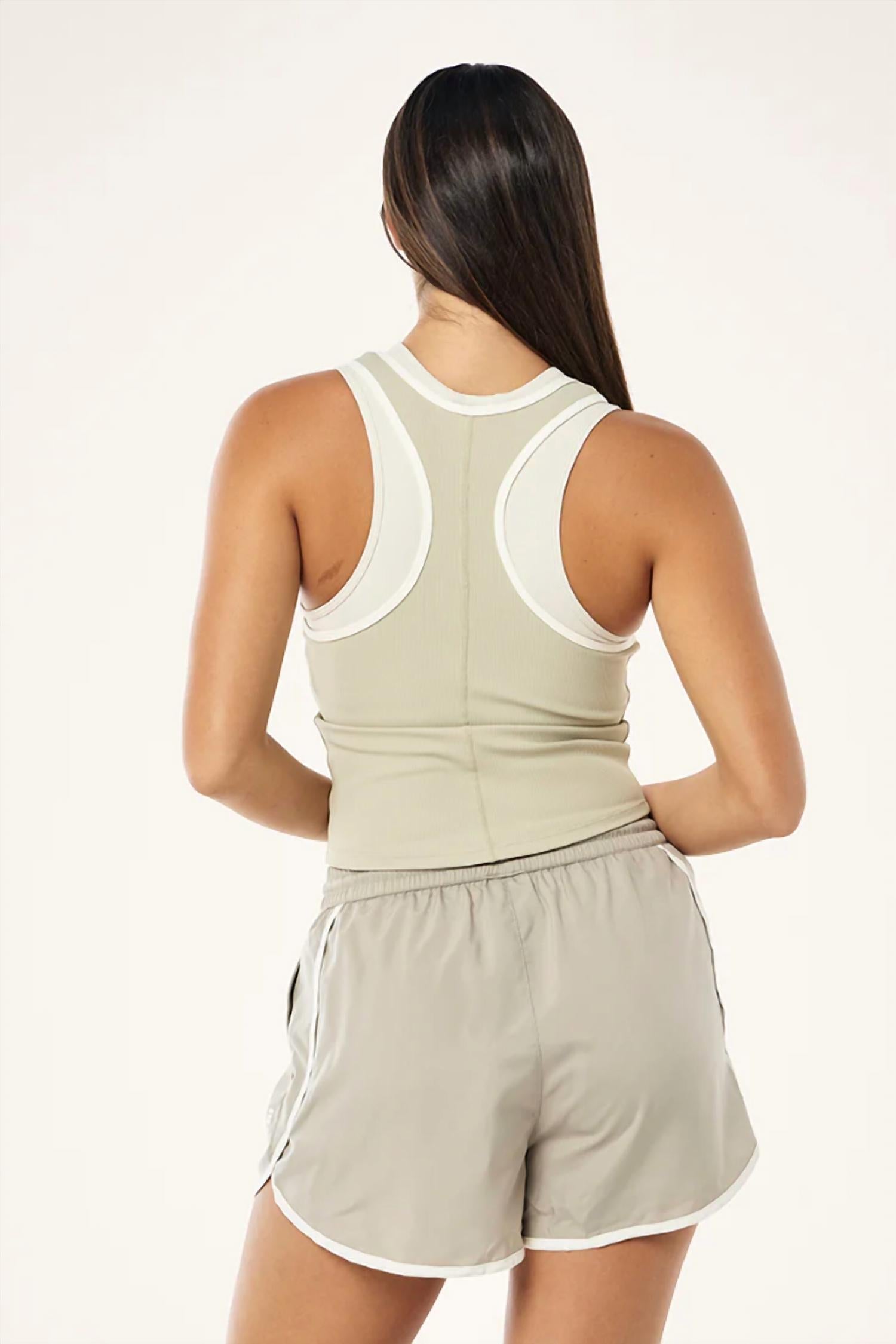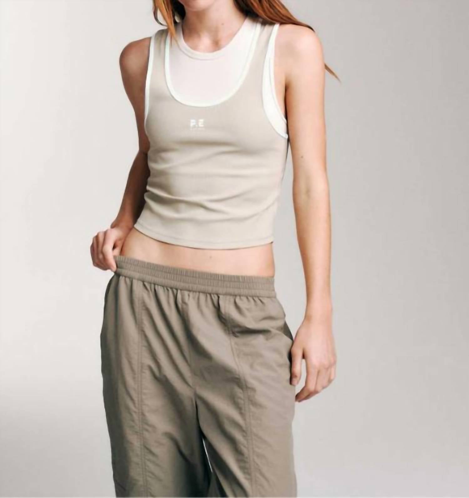 Fit, fabric and functionality. This tank top checks all the boxes. Elevate your activewear collection with the Westwood Tank by P.E. NATION, a luxurious sleeveless design in a timeless biscuit hue. Crafted from a blend of 82% Nylon and 18% Elastane, this scoop neck tank ensures a slim fit with double layer detailing and a supportive inner shelf bra. Closure comes as a convenient pull-on style, with a standout P.E Nation silicon logo patch and contrast binding completing the look. Machine wash cold inside-out and line dry in the shade, keeping your piece sophisticated and ready for any casual occasion.