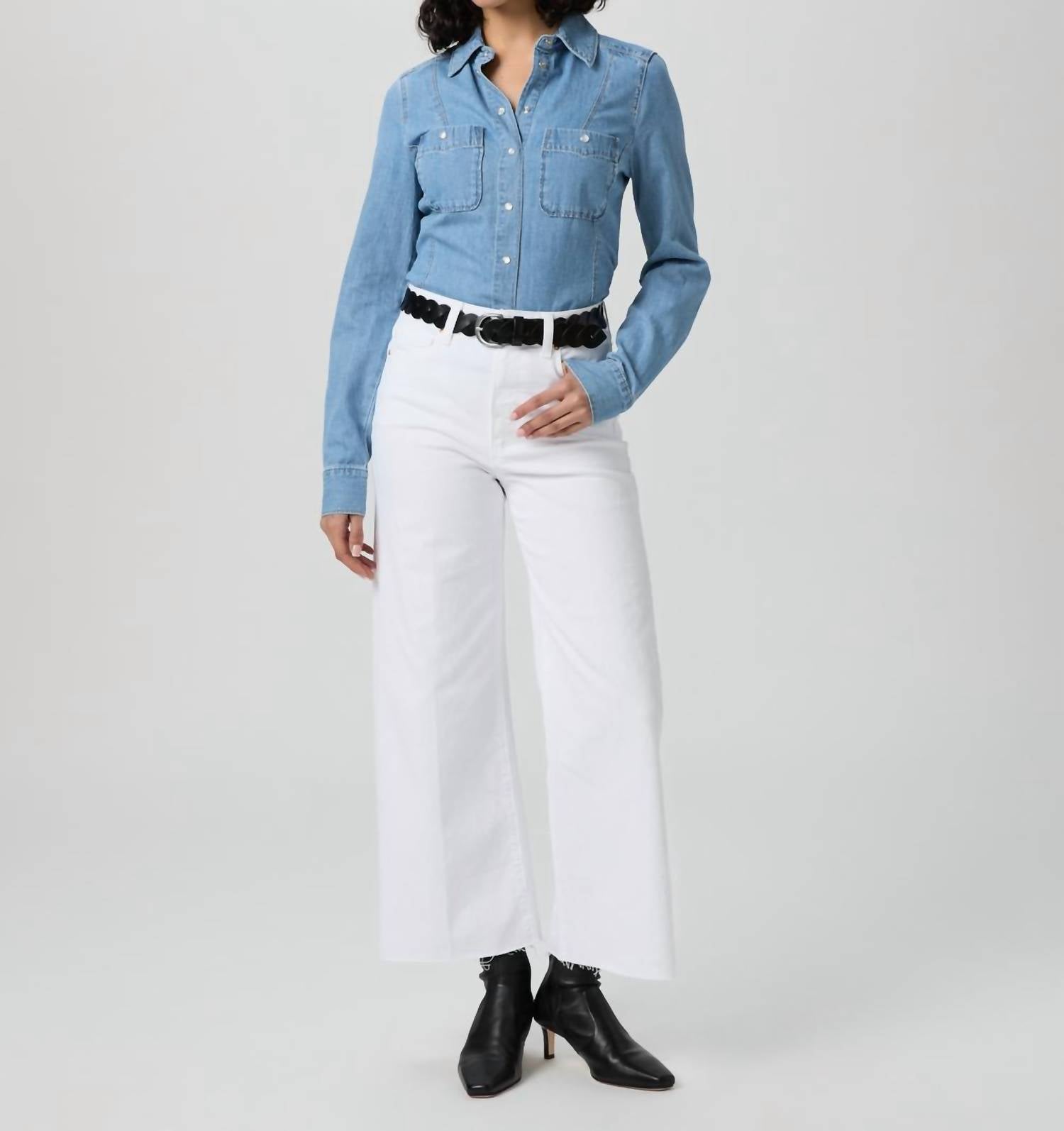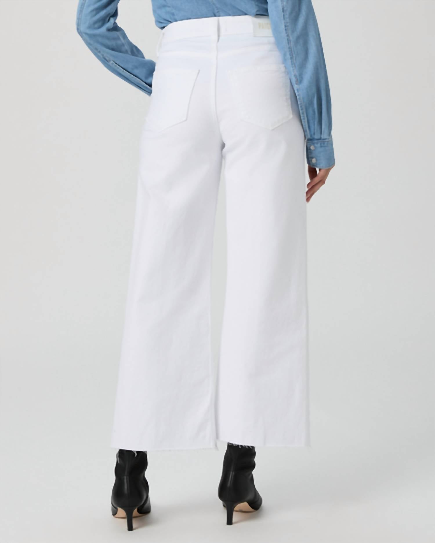 Just as cute as they are comfortable. Meet the Anessa Raw Hem Jean by Paige, a high-waisted masterpiece that delivers effortless chic with its flared wide-leg design. These ankle-length jeans in crisp white feature a raw hem and are crafted from comfort stretch denim, providing just the right amount of stretch and coverage. The solid pattern and button closure enhance its appeal, making it a versatile addition to any wardrobe. Enjoy the convenience of functional pockets and easy care with machine washing. 98% Cotton, 2% Elastane.