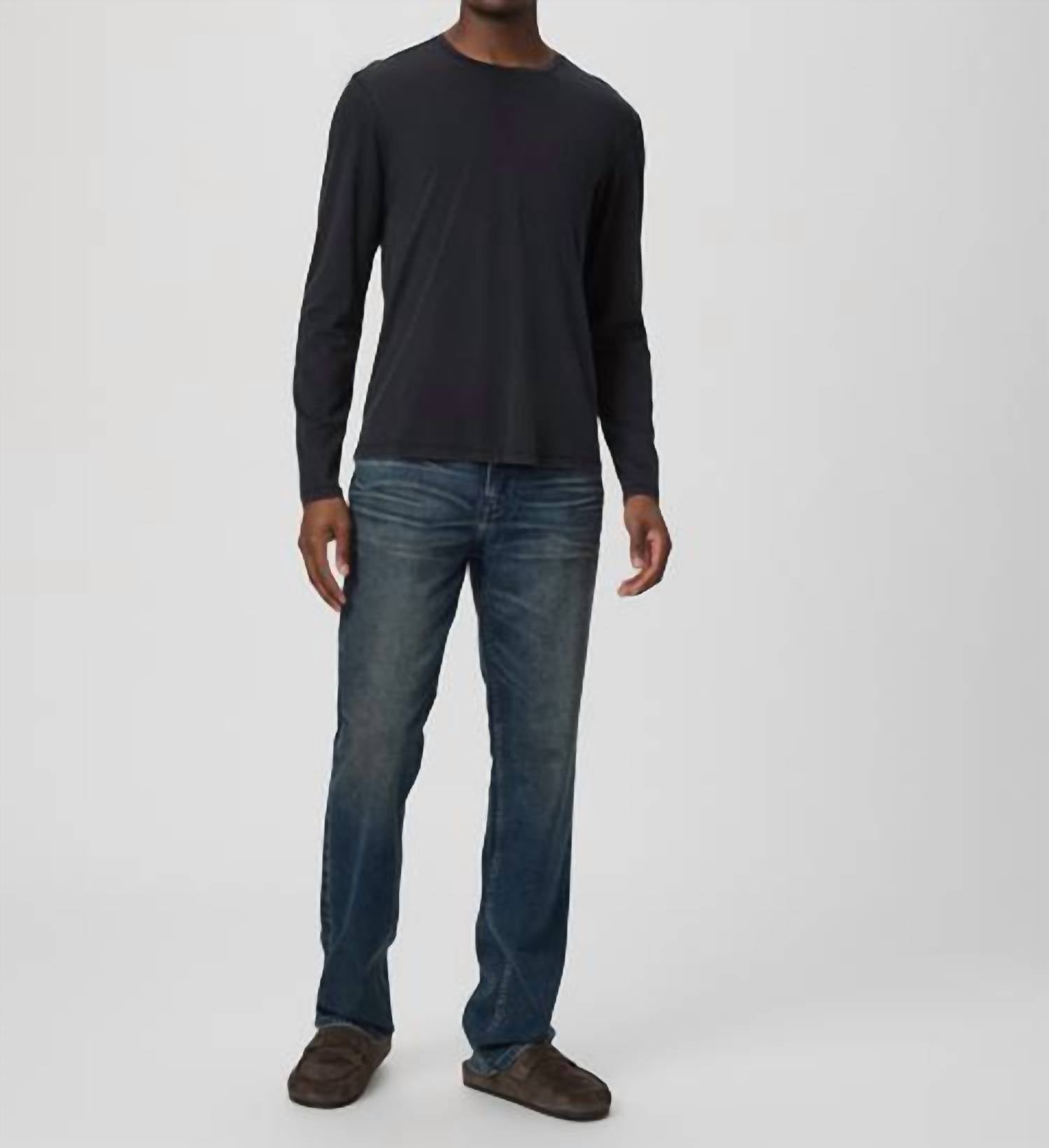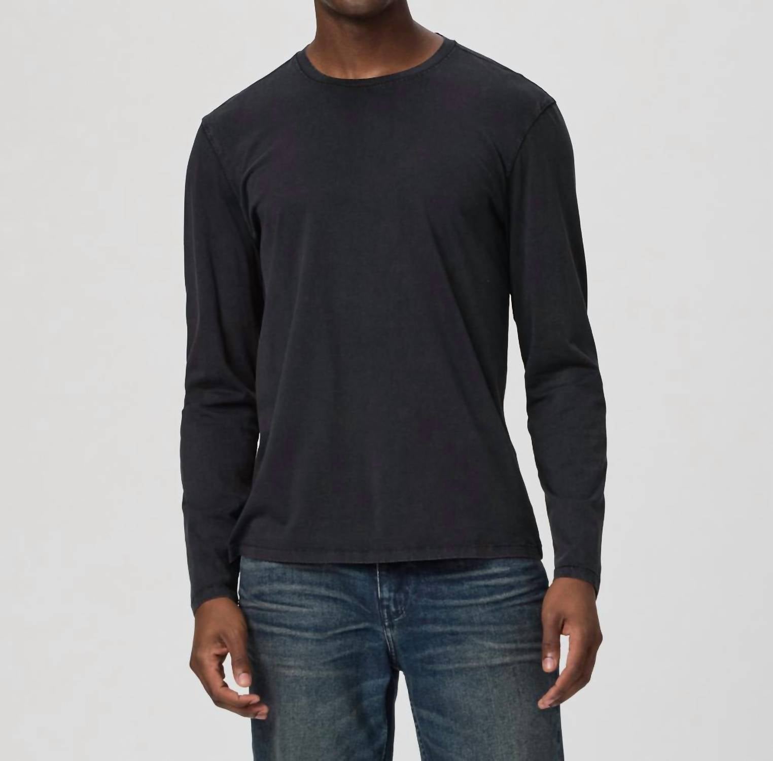Introducing the Enzo Long Sleeve Tee by Paige, crafted from supremely soft 100% cotton with a vintage tee feel. This tee features long sleeves, a crewneck, a raw edge chest pocket, and a slightly curved hem for added style. The vintage black shade has been pigment washed to achieve a unique high and low effect. Closure: Pull on. Perfect for layering or wearing solo, this tee adds a touch of streetwear flair to your summer camping attire.
