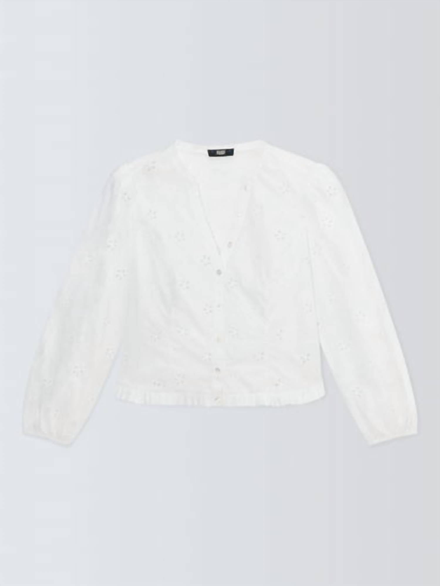 A versatile blouse that works from desk to dinner! Floral print. Button-up neck and three-quarter length sleeves. 100% cotton.