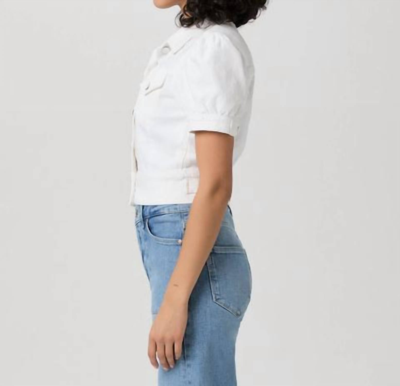 Throw this adorable jacket over just about anything for an effortlessly stylish look. The Kendra Classic Denim Jacket by Paige is a minimalist piece perfect for spring travels, featuring a solid white color and a structured collar. This jean jacket's short sleeves are crafted from a soft cotton blend, composed of 98% Cotton and 2% Elastane, offering both comfort and style. It includes functional pockets and a classic button closure. For care, simply hand wash to maintain its quality and appearance.