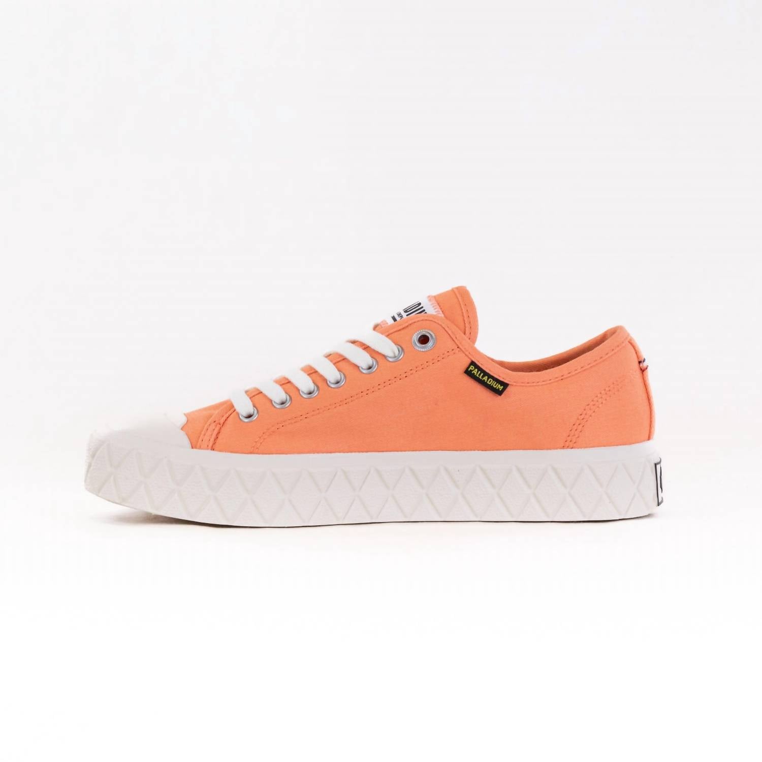 When fashion and function come together seamlessly. Meet the Women's Palla Ace Canvas Organic Sneakers by Palladium, a chic nod to French heritage in vibrant Sunstone Orange. These low-cut sneakers are crafted from 100% organic cotton for the upper material, lining, and insock, ensuring both style and sustainability. Featuring a 100% rubber outsole and a comfortable flat heel height of 25mm, these sneakers boast a lace-up closure and a durable rubber toecap for everyday wear. Ideal for spring outings, they're adorned with a side woven label and embroidery logo, reflecting both tradition and modern values while being proudly vegan.