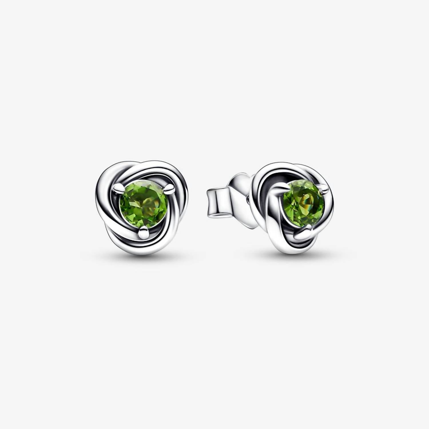 eye-catching earrings for every occasion. Introduce a touch of elegance with the Women's August Crystal Birthstone Eternity Circle Stud Earrings by Pandora, a striking pair perfect for adding color to your ensemble. Crafted from sterling silver, these earrings boast a hand-finished infinity braid design featuring vibrant light green man-made crystals, each symbolizing eternity. They are made to last, with a dimension of 3.4mm depth, 8mm height, and 8.2mm width. Ideal for everyday wear, these alluring studs are a testament to Pandora's commitment to quality and style.