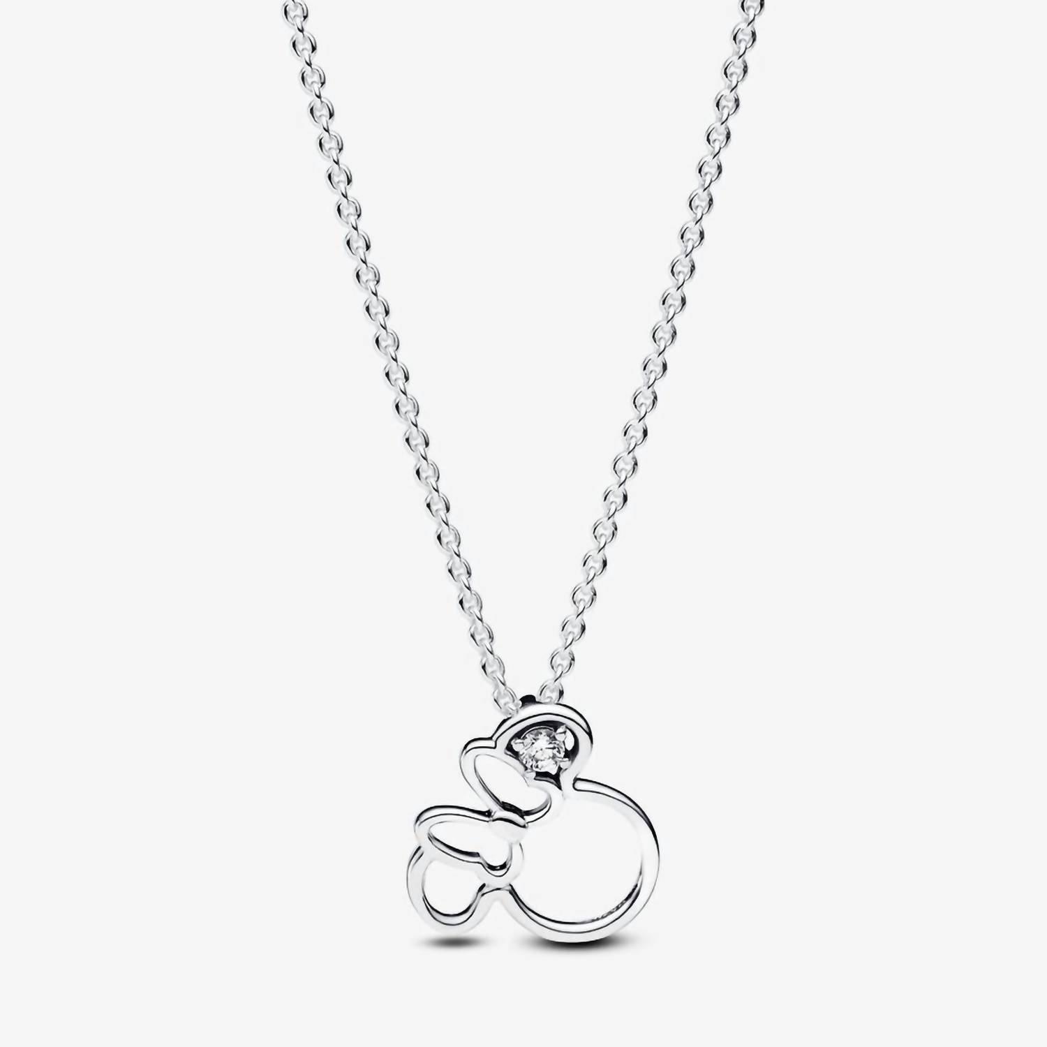 Layer this necklace or wear it on its own. Either way it's a win-win. Embrace the enchantment with the Women's Disney Minnie Mouse Silhouette Collier Necklace by Pandora. This sterling silver piece features Minnie's iconic head and bow adorned with a sparkling cubic zirconia, set on an adjustable 45cm chain for styling versatility. Closure: Lobster clasp. A perfect blend of Disney magic and exquisite craftsmanship.