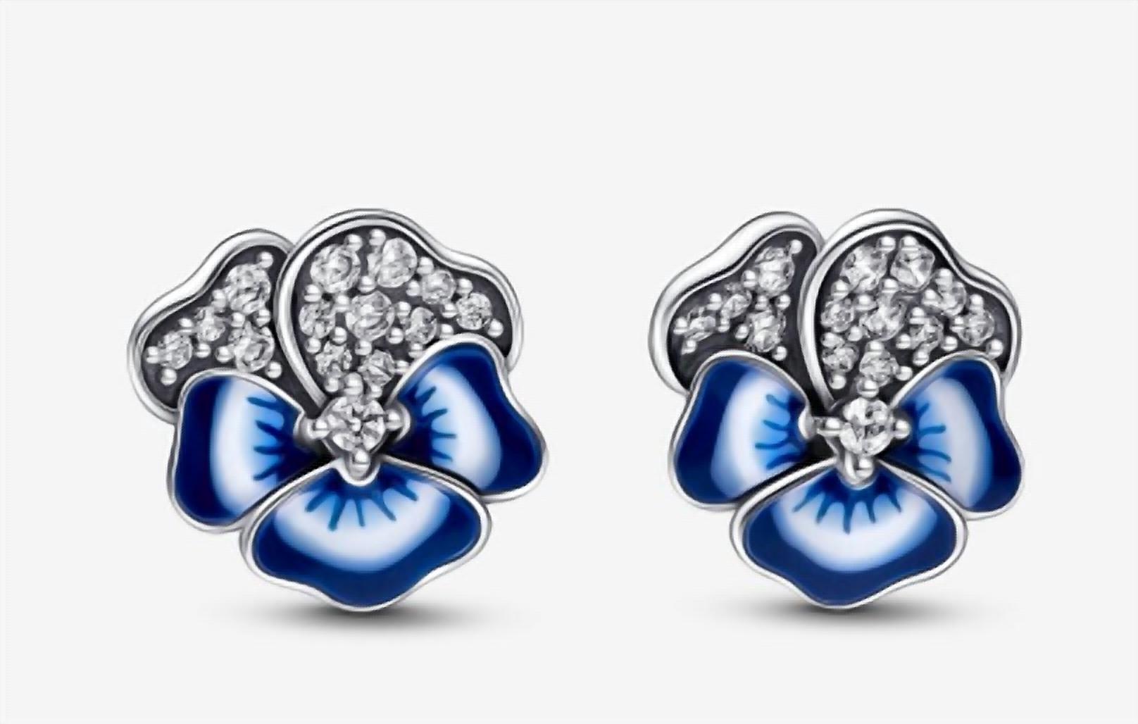 Enhance your spring accessories with Pandora's Pansy Flower Stud Earrings, a captivating blend of artistry and elegance in blue. Crafted from sterling silver, each earring showcases two sparkling pavé petals and three petals adorned with hand-painted shaded white and blue enamel for a unique touch. Embrace the symbolism of pansies representing love in its many forms. Perfect for pairing with other blue pansy pieces from the collection for a beautifully coordinated look.