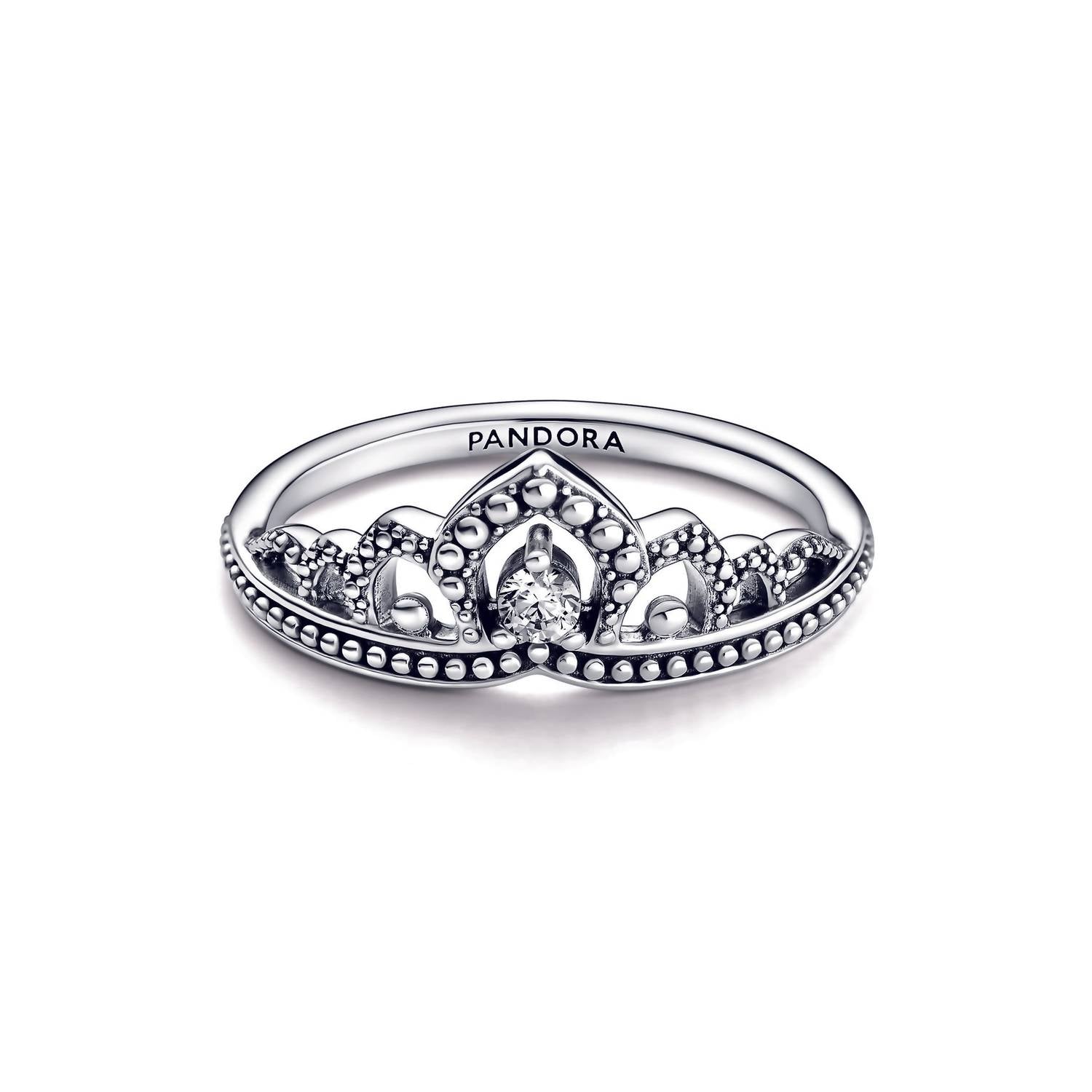 Wear this ring stacked or by itself... you can't go wrong. Introducing the Women's Regal Beaded Tiara Ring by Pandora, an exquisite piece designed to crown your collection with elegance. Crafted from sterling silver with dazzling silver plating, this ring features an ornate, arched design adorned with a brilliant-cut cubic zirconia stone. Its textured microbeading follows its sparkling contours, adding a fairytale feel to your look. Elevate your everyday style with this majestic fashion ring.
