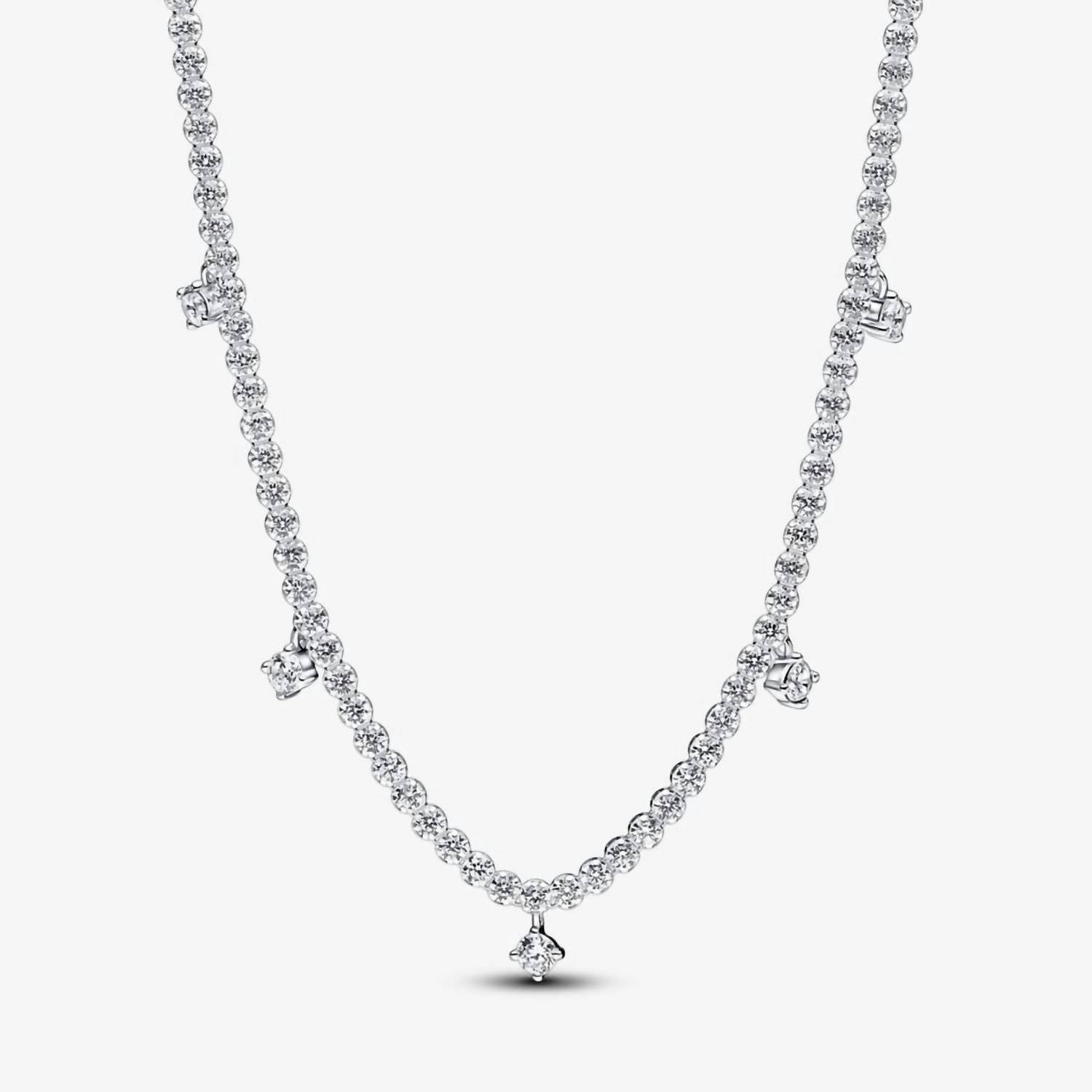 The perfect stand-out necklace that complements even the most basic t-shirt. Unveiling the Women's Sparkling Drop Collier Necklace by Pandora, an embodiment of timeless elegance with a modern flair. Crafted in sterling silver, this exquisite piece features sparkling clear cubic zirconia stones arranged in a pavé pattern and accented by larger stones that elegantly dangle. This adjustable necklace offers the versatility to wear at three lengths, making it a perfect addition to any collection. Stone: Cubic Zirconia; Color: Silver.Depth: 2.7 mmHeight: 4 mmWidth: 4 mm